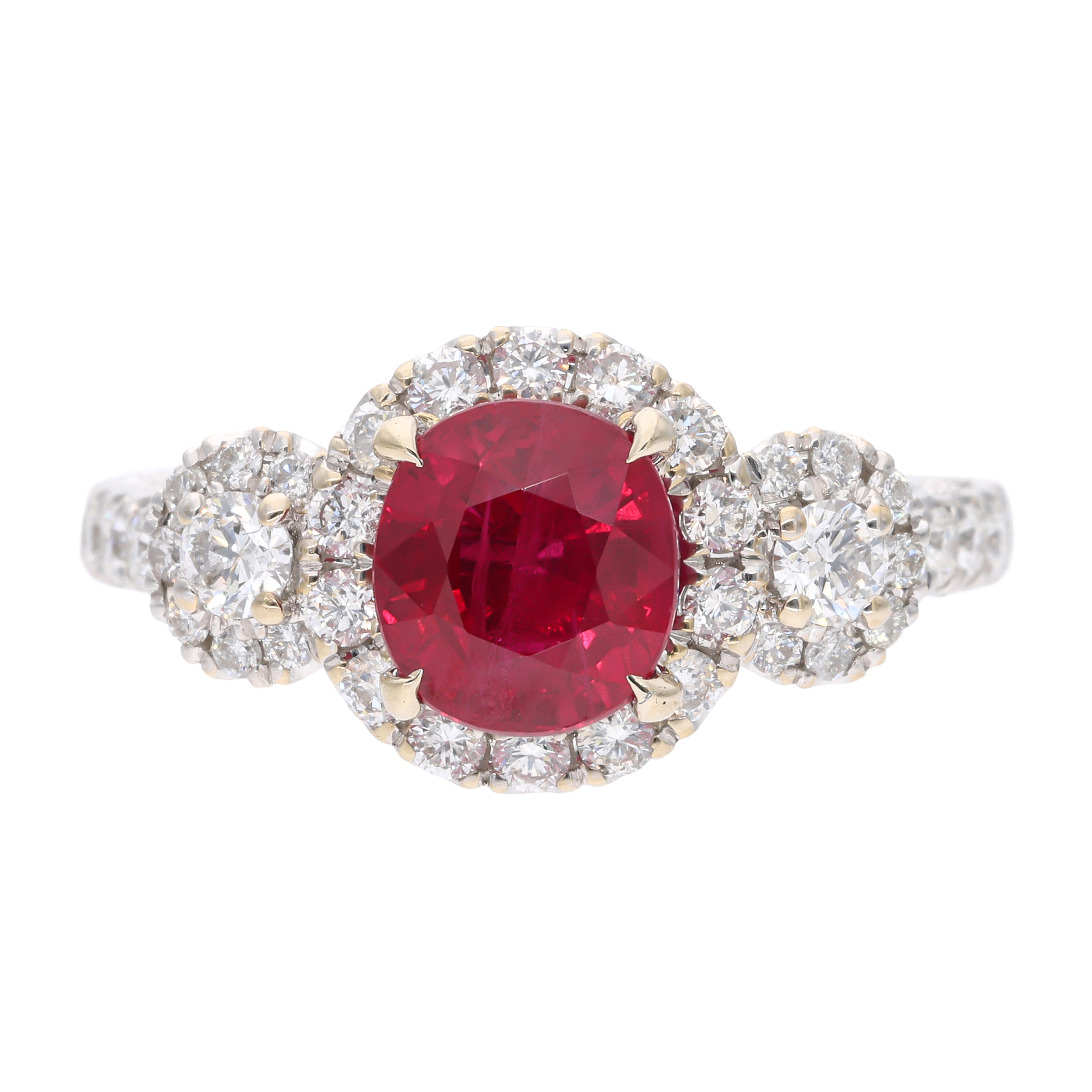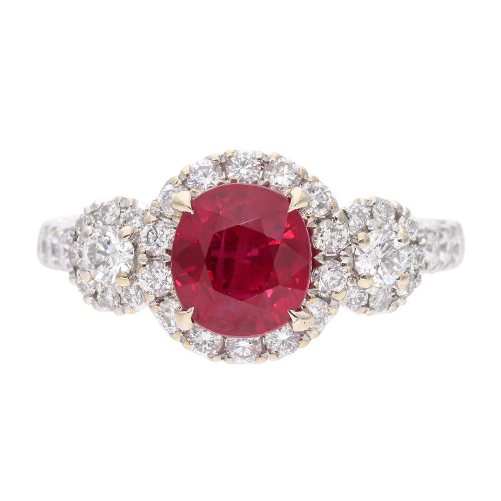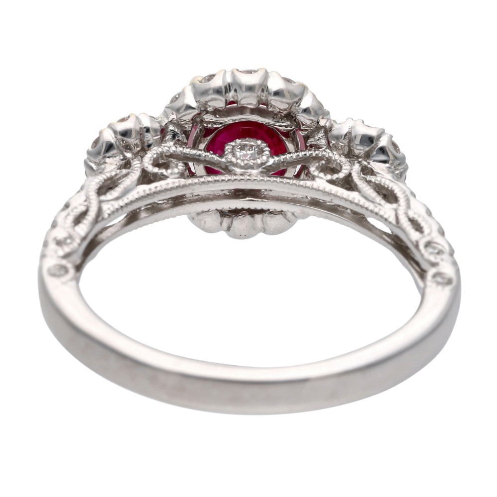 Designed as a cushion-shaped ruby, flanked by two white diamonds and surrounded by numerous round diamonds.