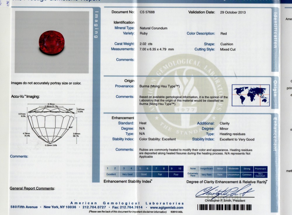 - Accompanied by AGL report CS 57688, stating that the ruby is of Burmese origin with signs of minor heat treatment