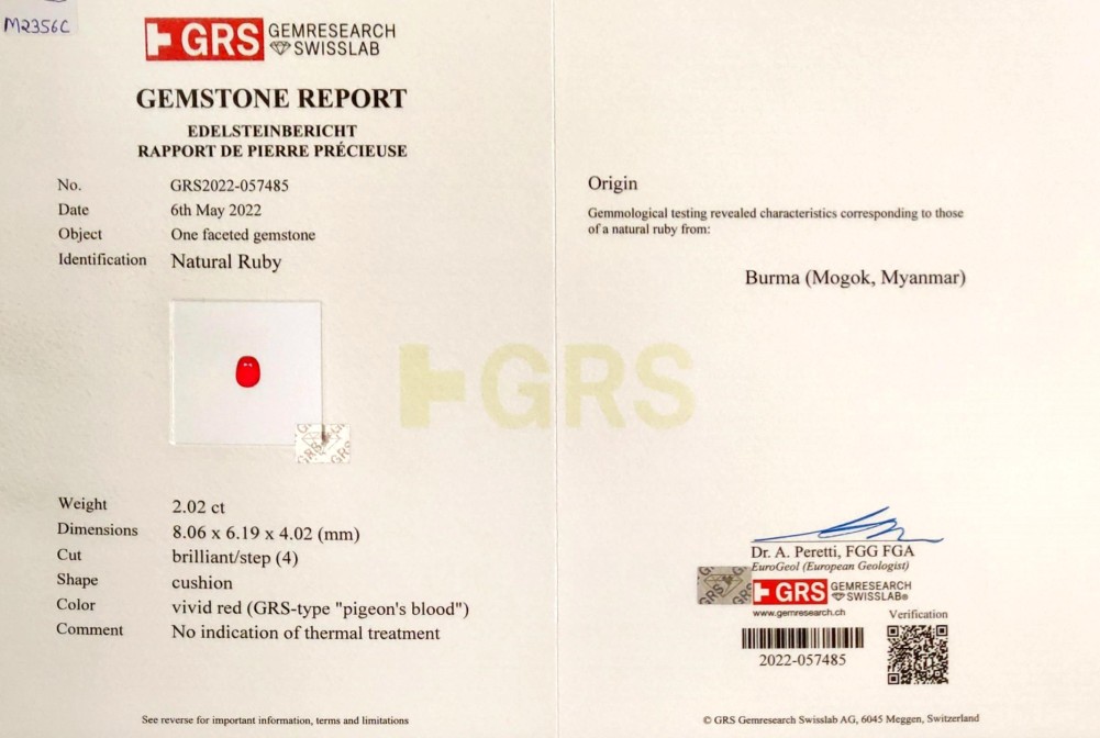 - Accompanied by GRS report no. 2022-057801, dated 6 May 2022, stating that the 2.02 carat ruby is Vivid Red color, of Burmese origin and has no indication of thermal treatment