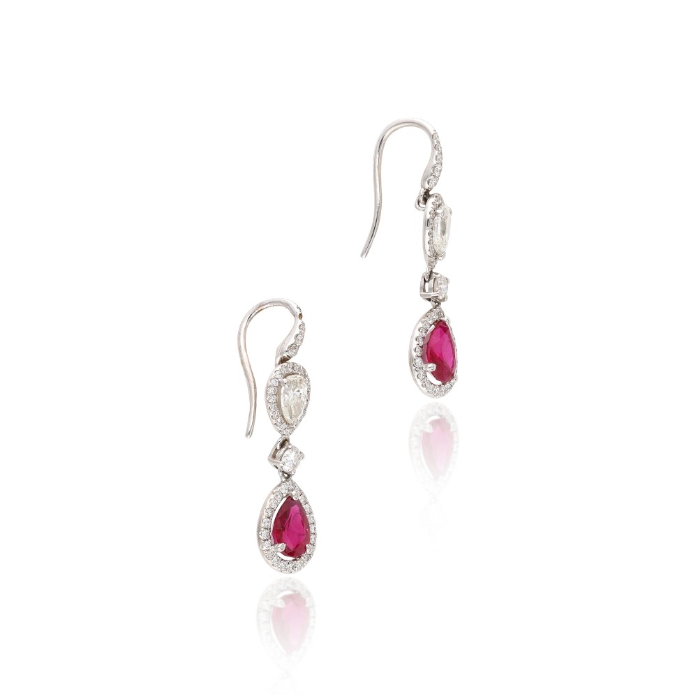 Set with 2 pear-shaped rubies, 2 round brilliant and 2 pear-shaped diamonds, accented by round diamonds.