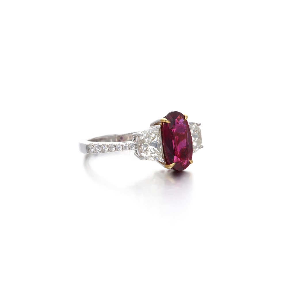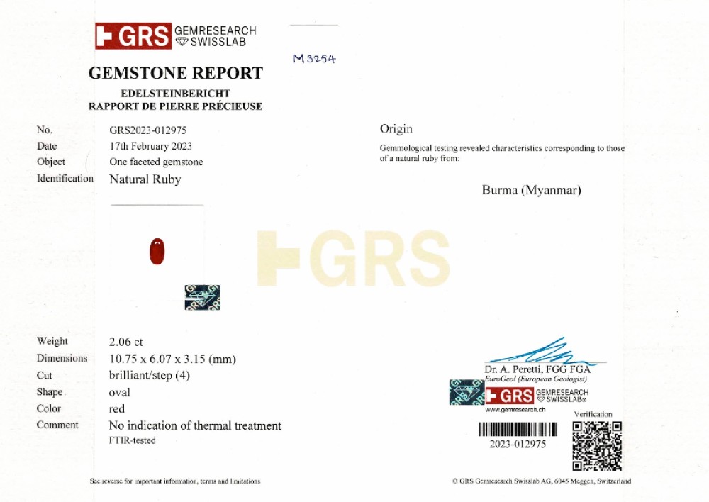 - Accompanied by GRS report no. 2023-012975, dated 17 February 2023, stating that the 2.06 carat ruby is of Burmese origin, with no indication of thermal treatment