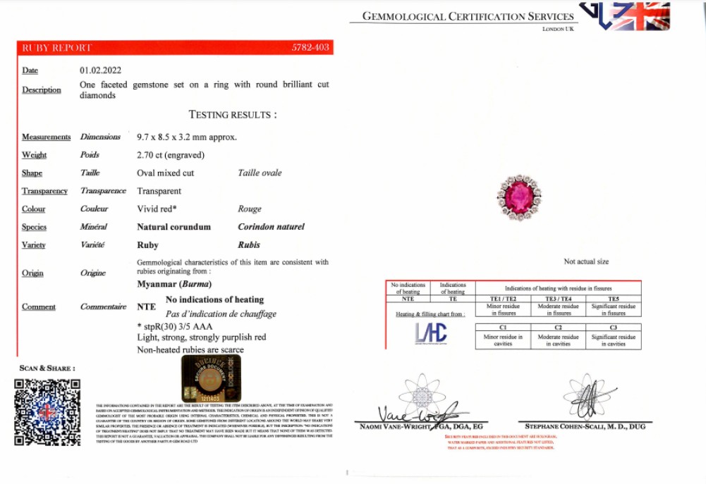 - Accompanied by GCS report number 5782-403, dated 1 February 2022, stating that the oval mixed-cut ruby weighs 2.70 carats and is of Burmese origin with no indication of heating