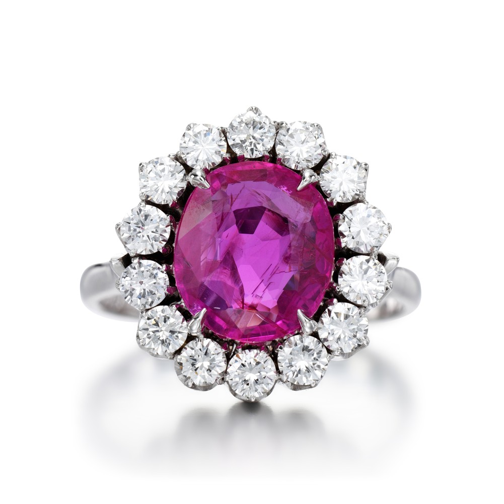 Featuring an oval-shaped Burmese ruby surrounded by a cluster of 14 round brilliant-cut diamonds.