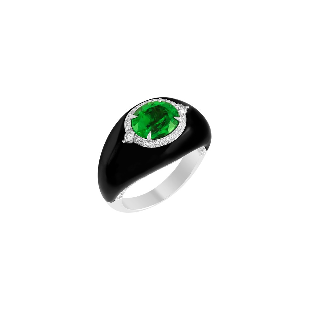 Centering an oval tsavorite garnet inlaid into black jade, accented by round brilliant-cut diamonds.