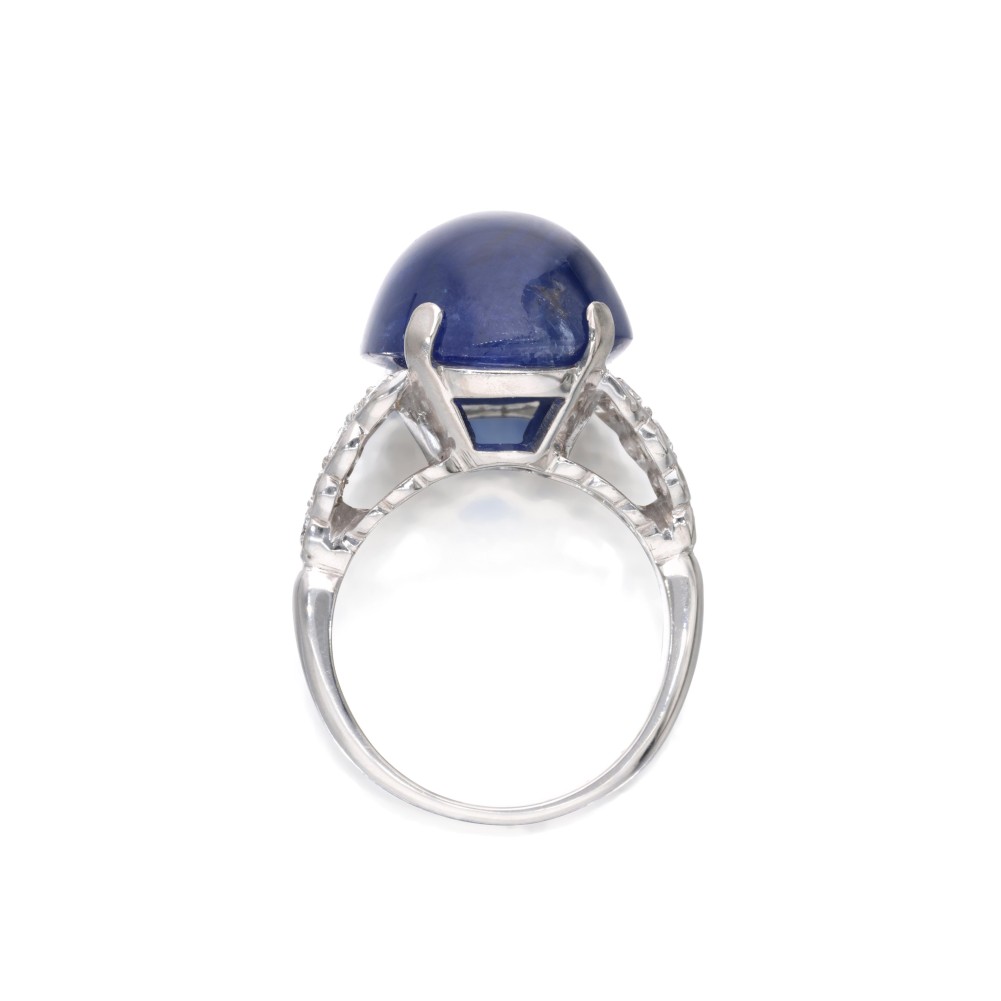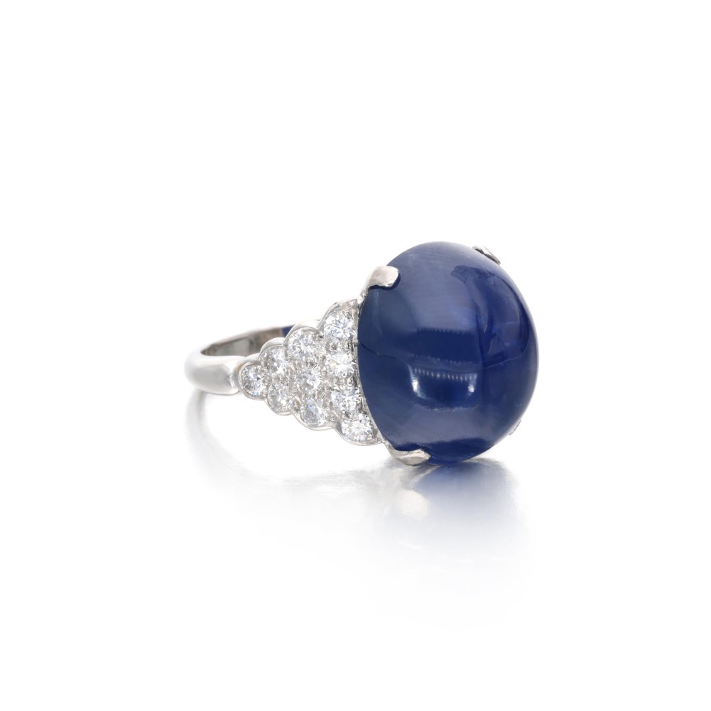 Composed of an oval-shaped Burmese sapphire cabochon and accented by round brilliant-cut diamonds.