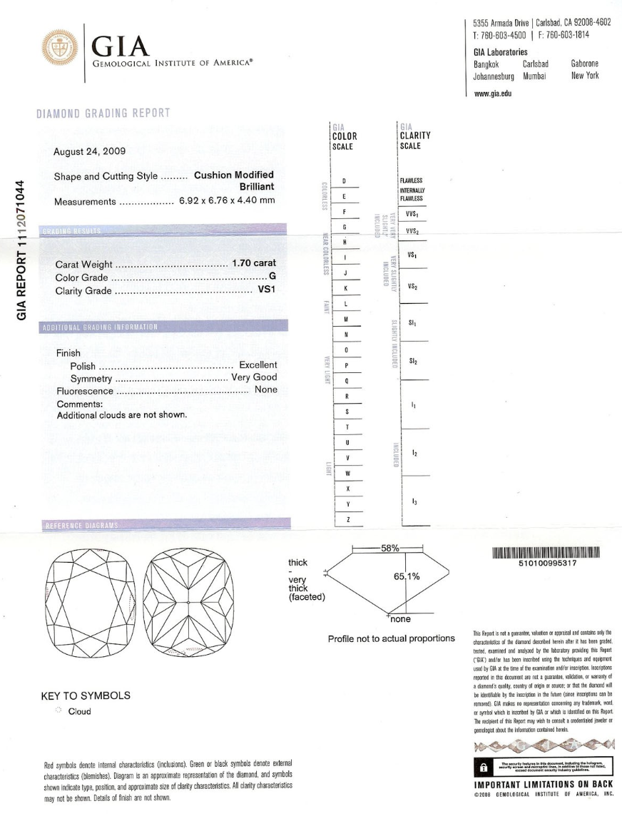 - Accompanied by GIA report no. 1112071044, dated 24 August 2009, stating that the 1.70 carat diamond is G color, VS1 clarity.
