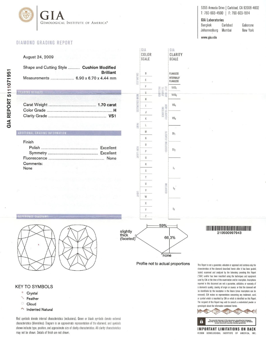 - Accompanied by GIA report no. 5111071951, dated 24 August 2009, stating that the 1.70 carat diamond is H color, VS1 clarity.