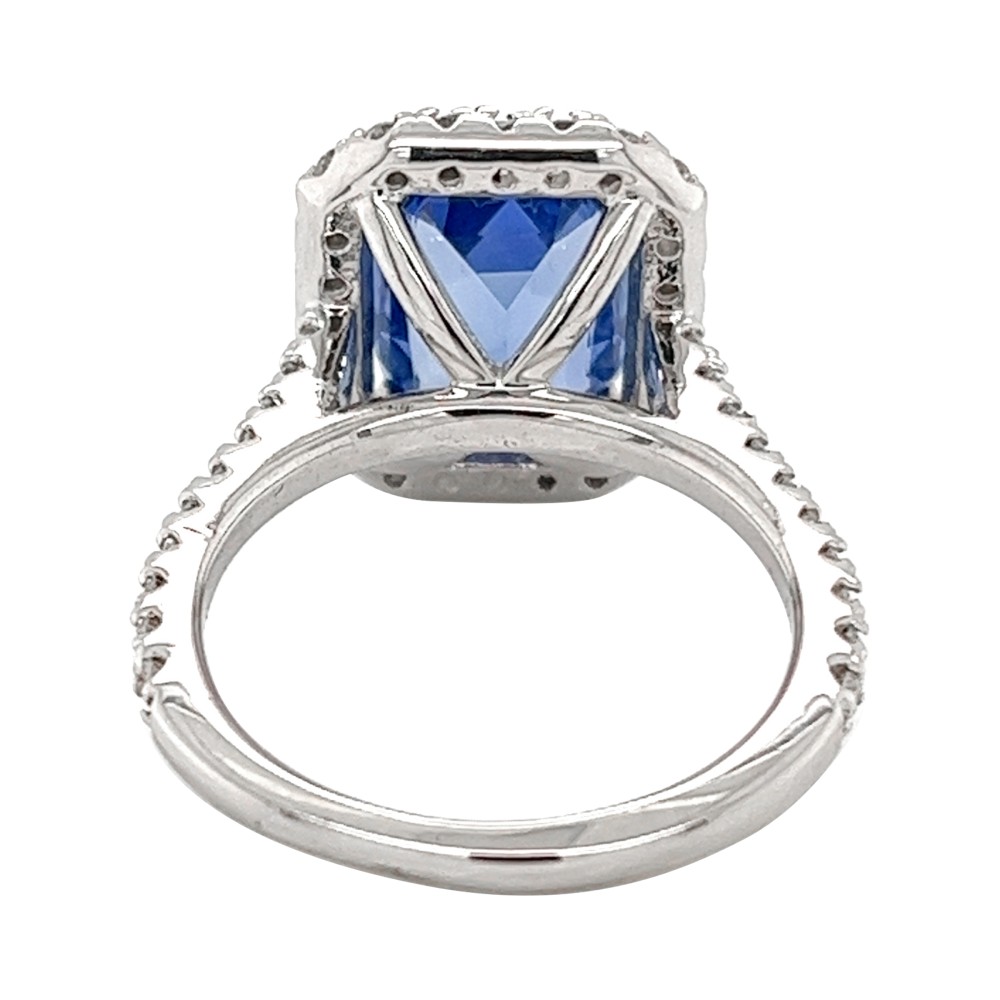 Centering a cushion-shaped sapphire, accented by 44 round diamonds.