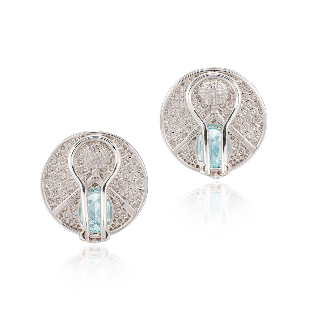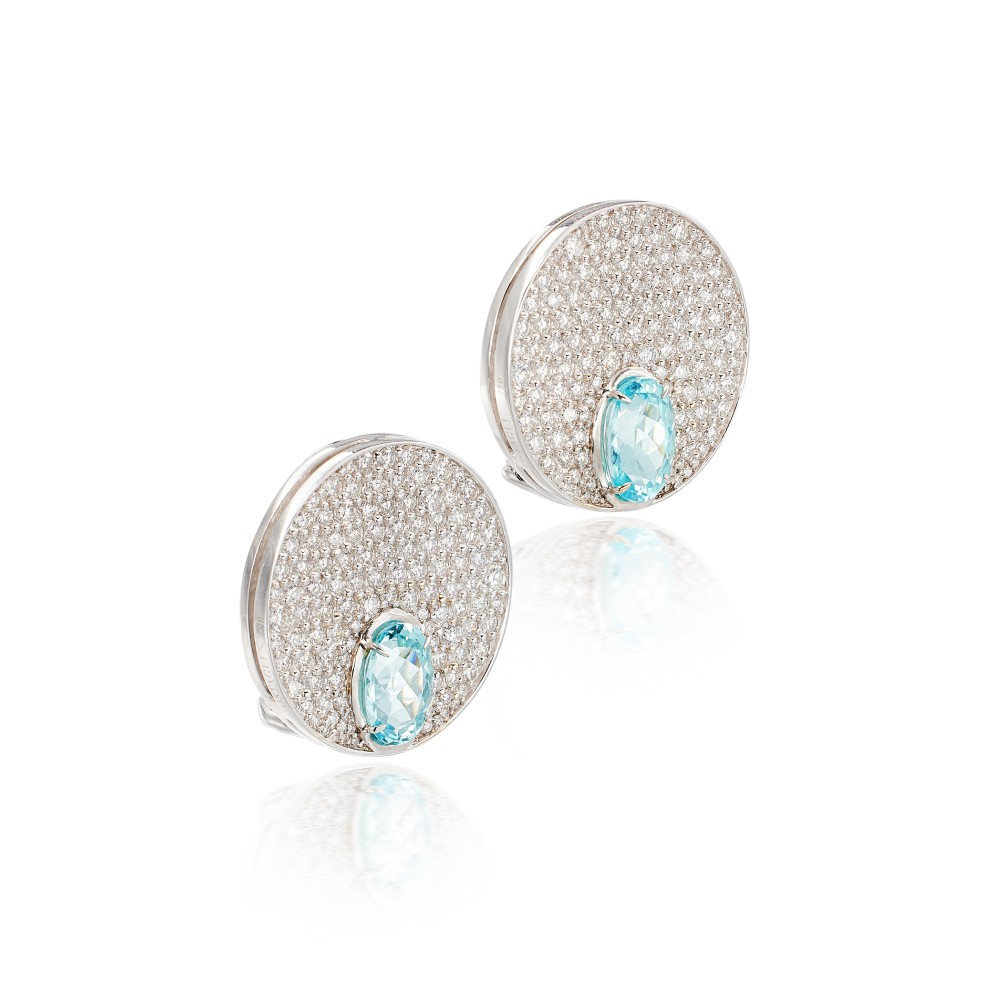 Disc earclips featuring oval-shaped Paraiba-type tourmalines, accented by pav? diamonds.