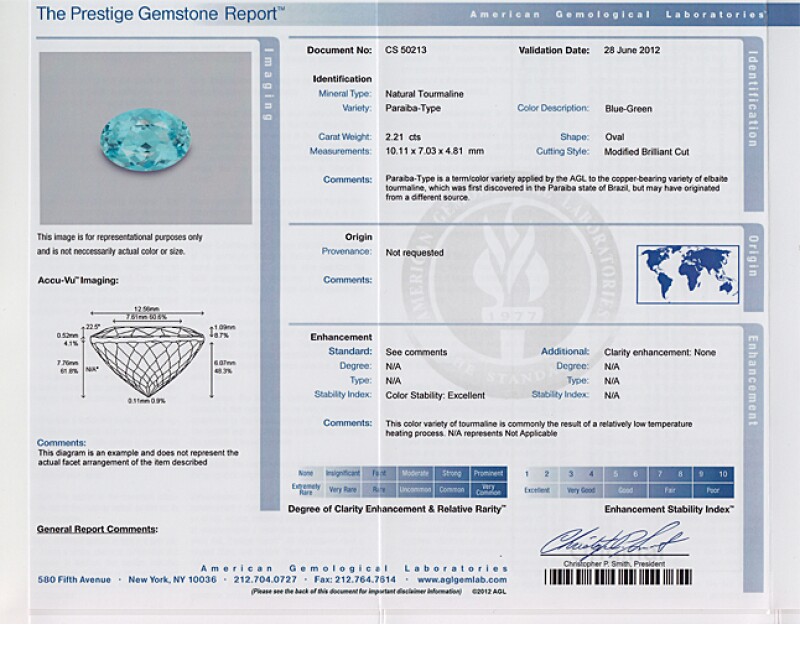 - Accompanied by AGL report no. CS 50213, dated 28 June 2012, stating the 2.21 carat tourmaline is Paraiba-Type, “Blue-Green” color, with no clarity enhancement – Soft copy only