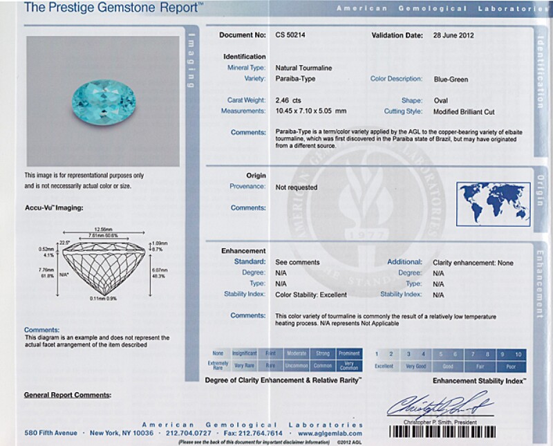- Accompanied by AGL report no. CS 50214, dated 28 June 2012, stating the 2.46 carat tourmaline is Paraiba-Type, “Blue-Green” color, with no clarity enhancement – Soft copy only