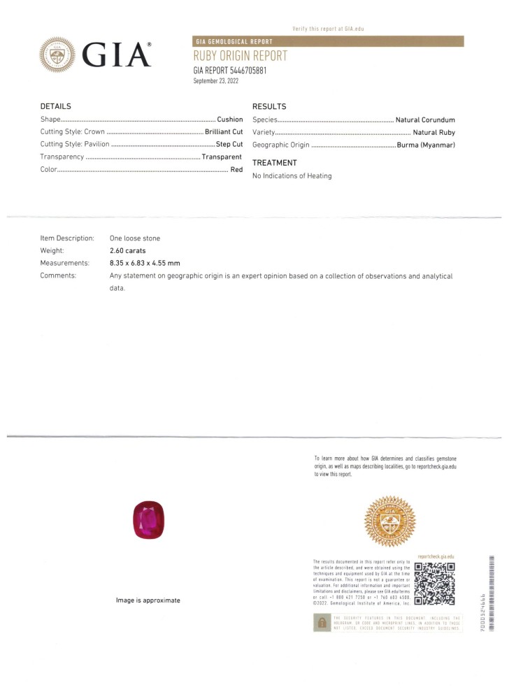 - Accompanied by GIA report no. 5446705881, dated 23 September 2022, stating that the 2.60 carat ruby is of Burmese (Myanmar) origin and shows no indications of heating
