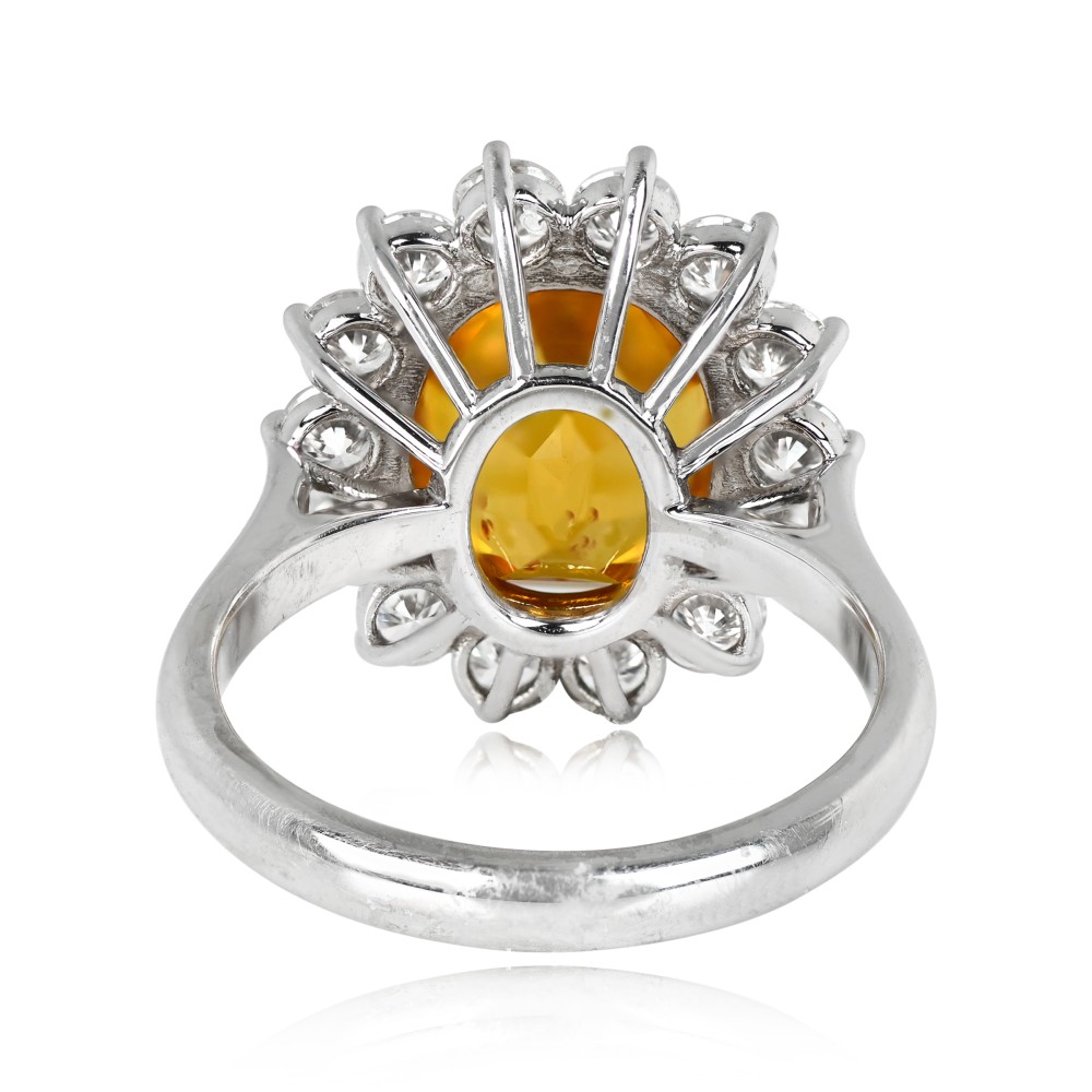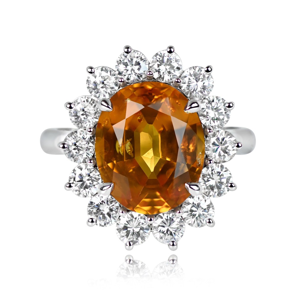 Centering an oval shaped yellow sapphire surrounded by a halo of round brilliant cut diamonds.