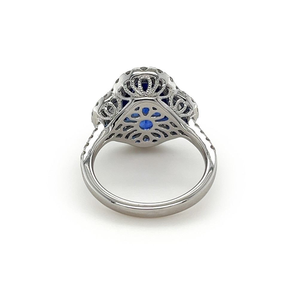 Centering an oval-shaped sapphire, flanked by 2 half moon-cut diamonds, surrounded by 36 round brilliant-cut diamonds.