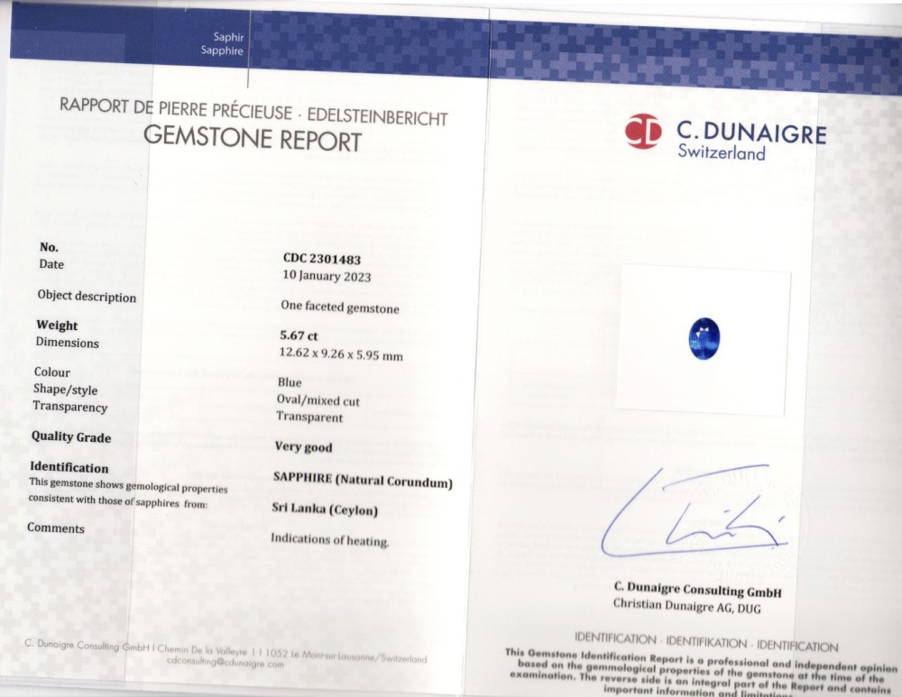 - Accompanied by a C.Dunaigre report no. 23014883, dated 10 January 2023, stating that the 5.67 carat sapphire is Blue color, originated from Sri Lanka (Ceylon) and has indications of heating