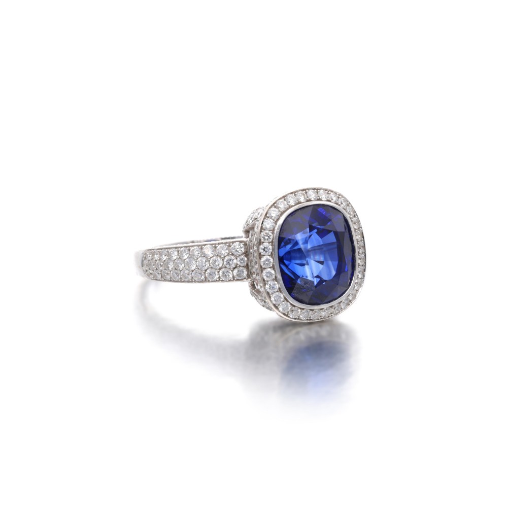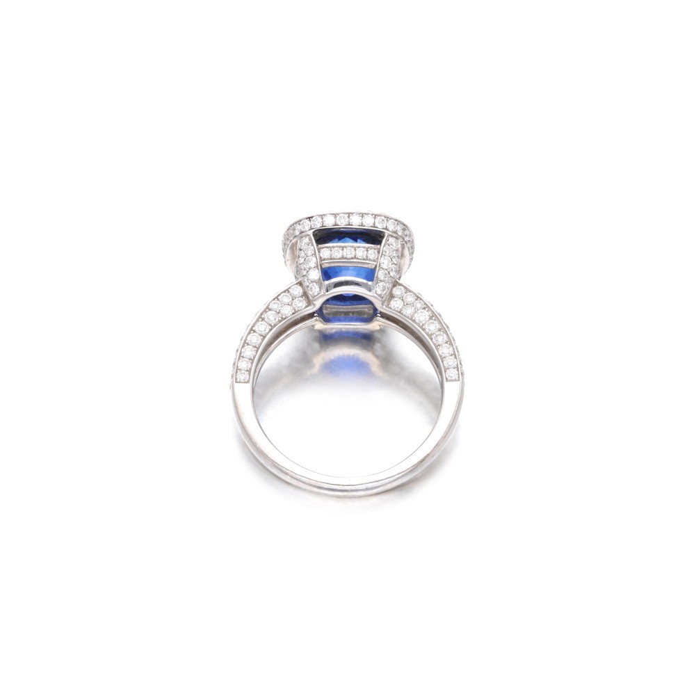 Composed of a cushion-shaped sapphire and accented by round brilliant-cut diamonds.