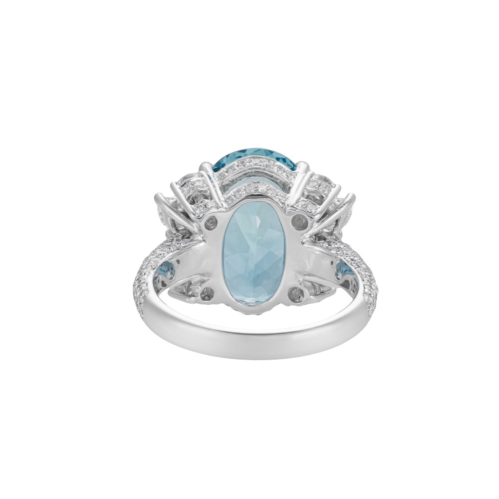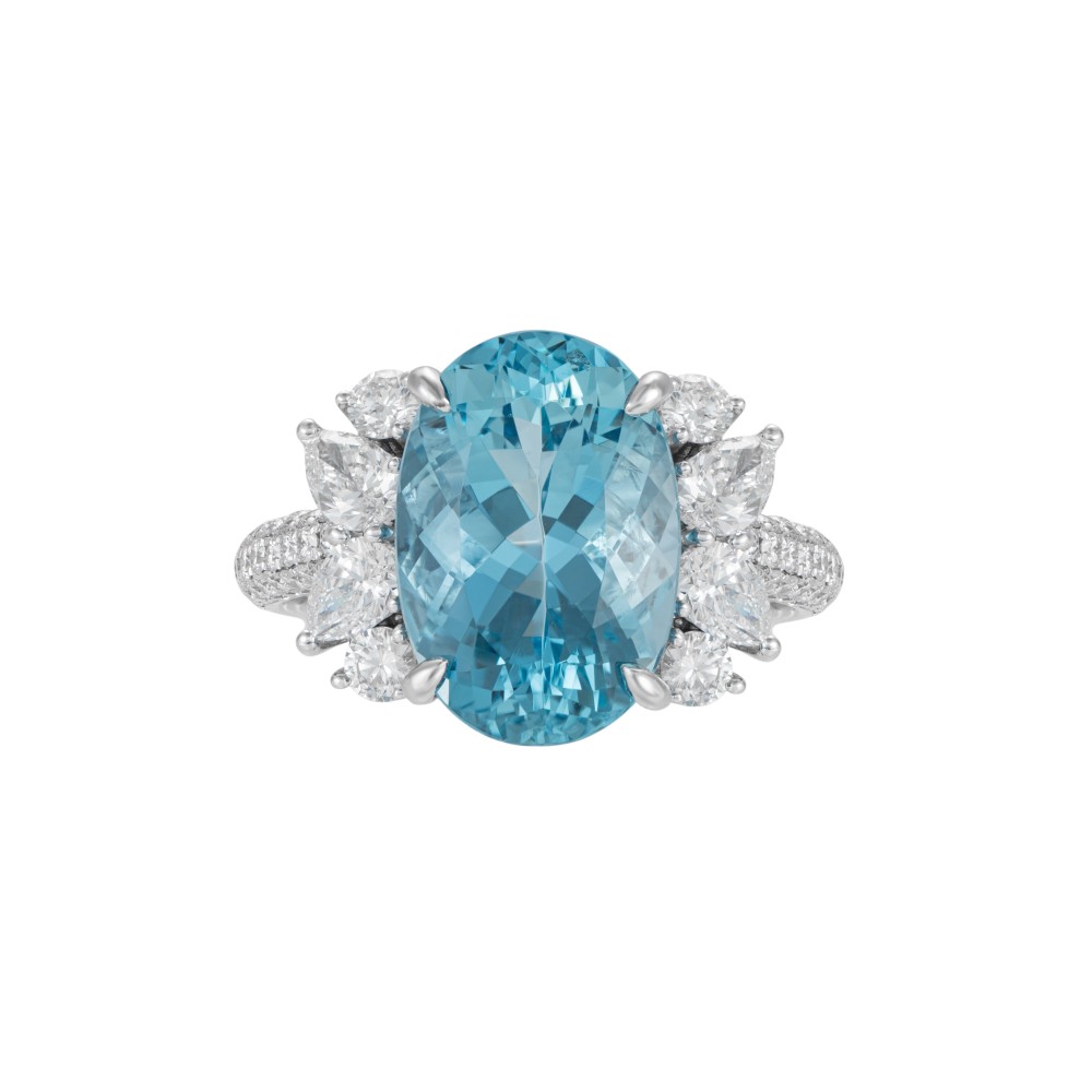 Featuring an oval-shaped aquamarine, accented by pear-shaped diamonds and round diamonds.