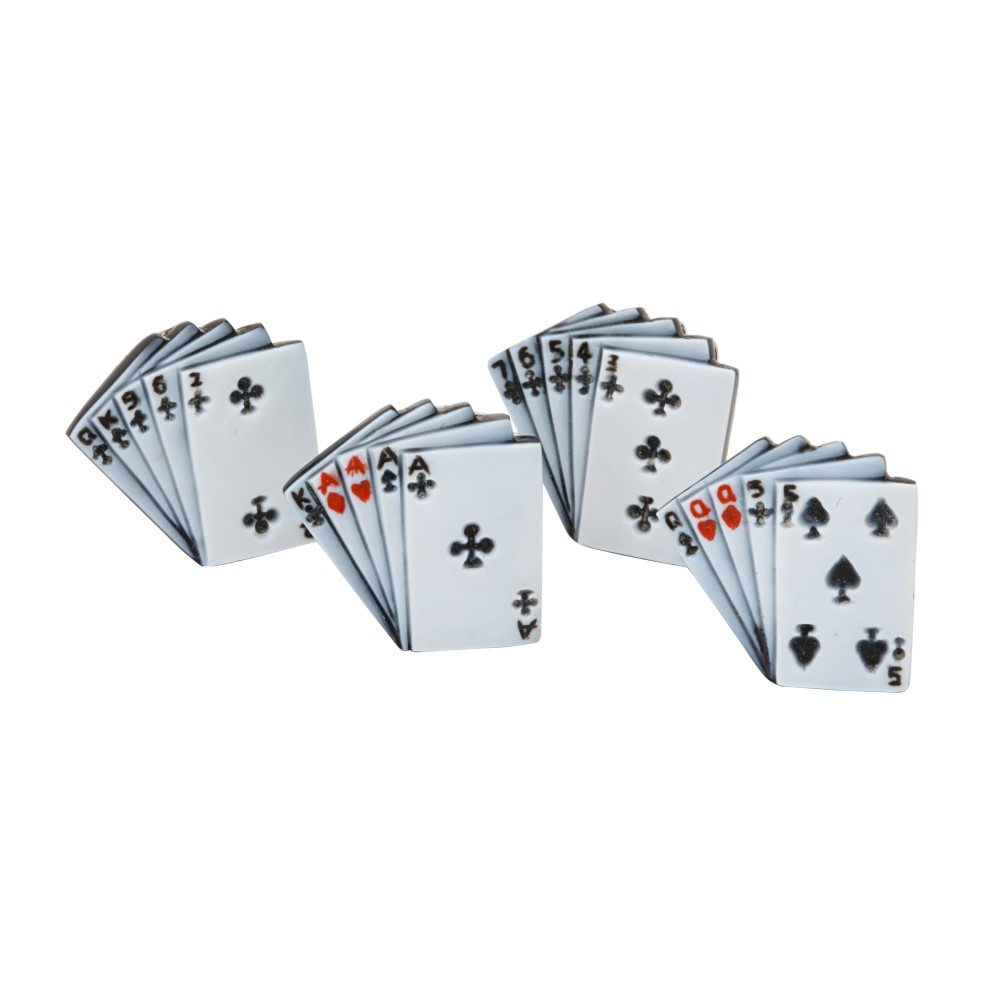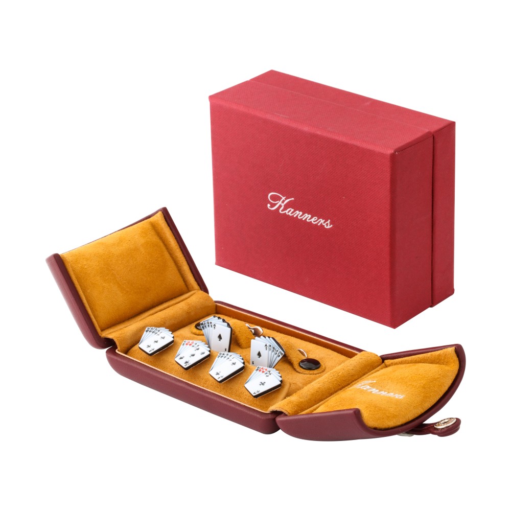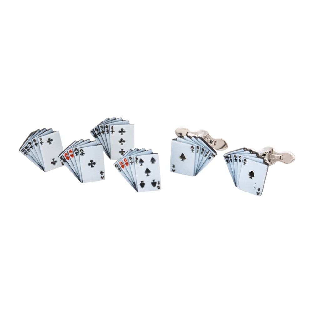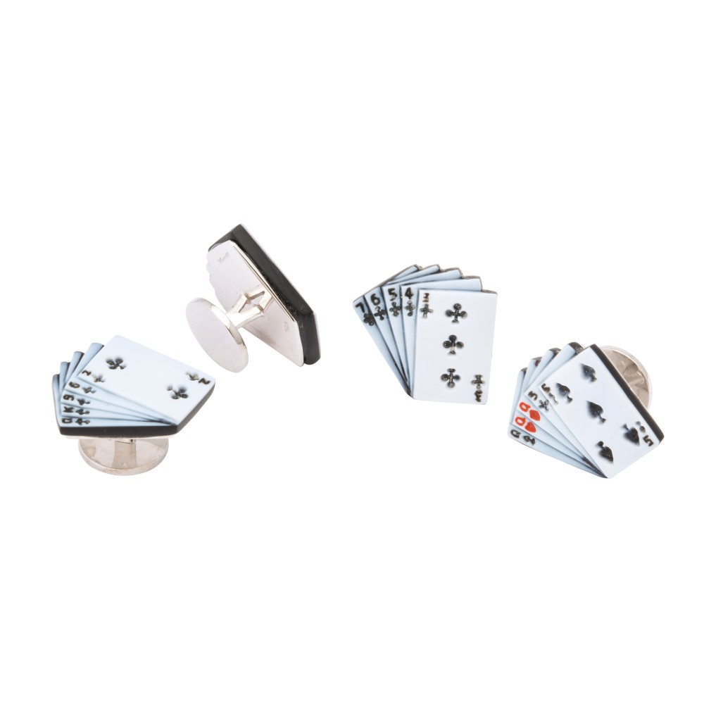 Includes pair of cufflinks and 4 shirt studs depicting winning poker hands, set with enamel, black and white layered agate.