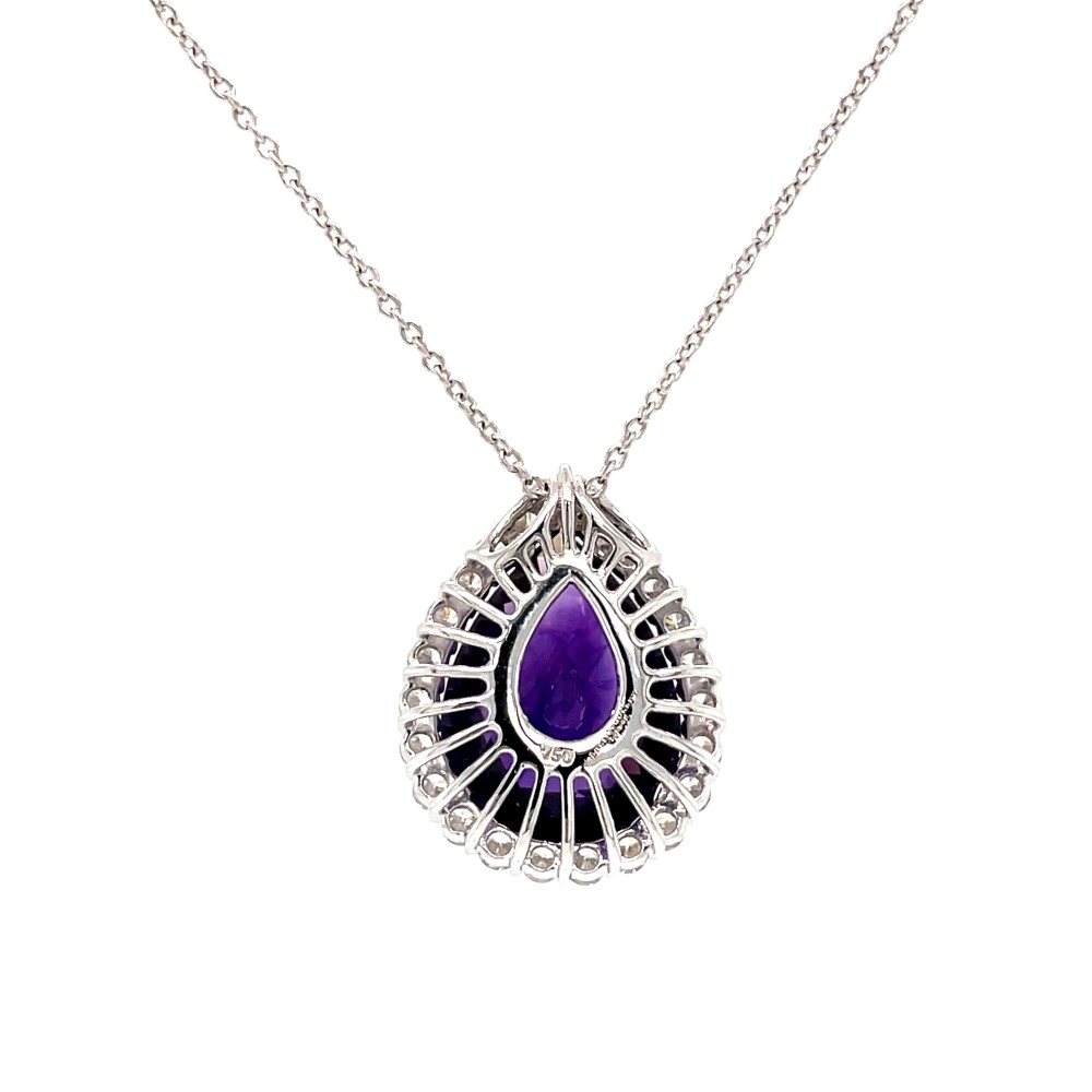The pendant featuring a pear-shaped amethyst to the center of a cluster of round brilliant-cut diamonds suspended by a fine adjustable trace chain.