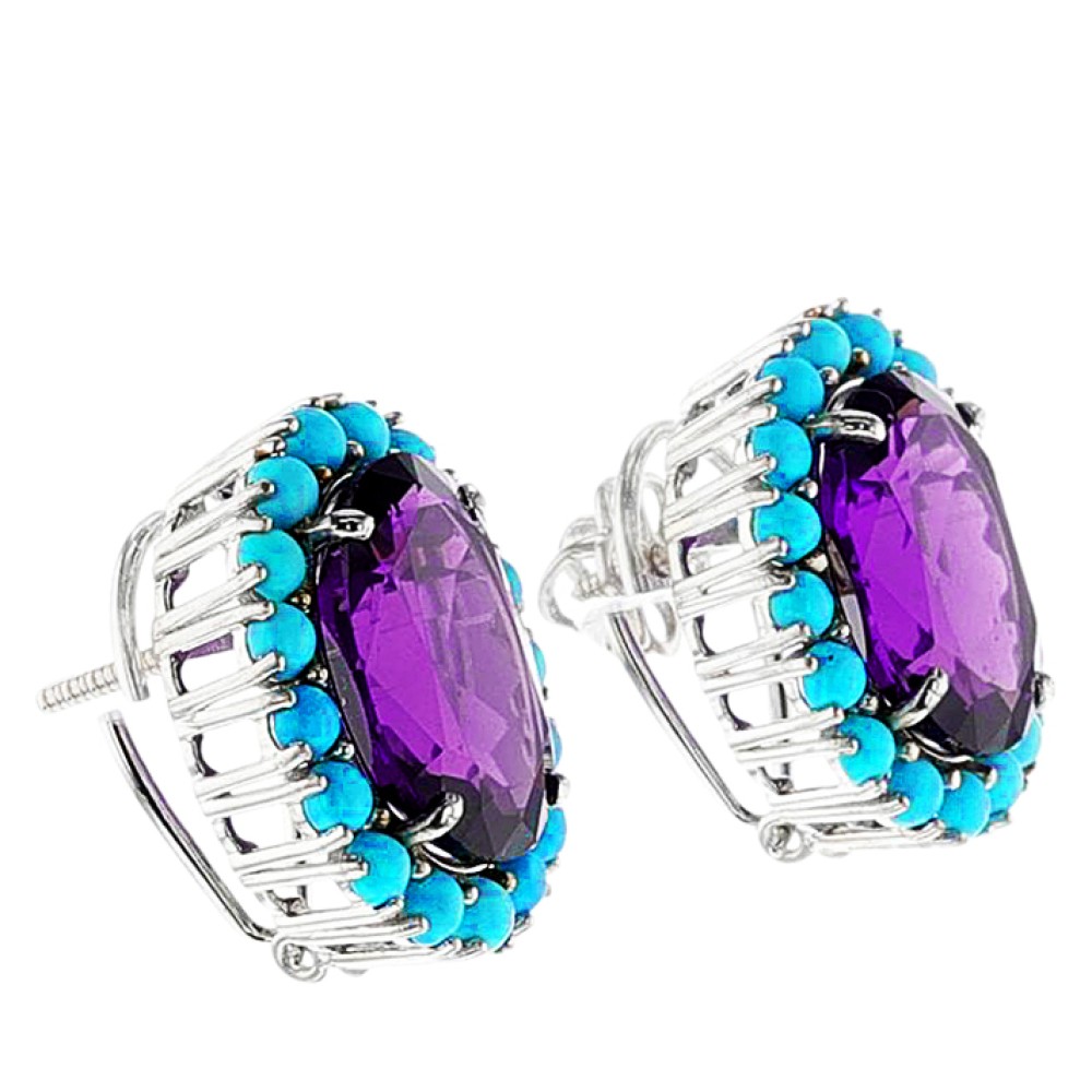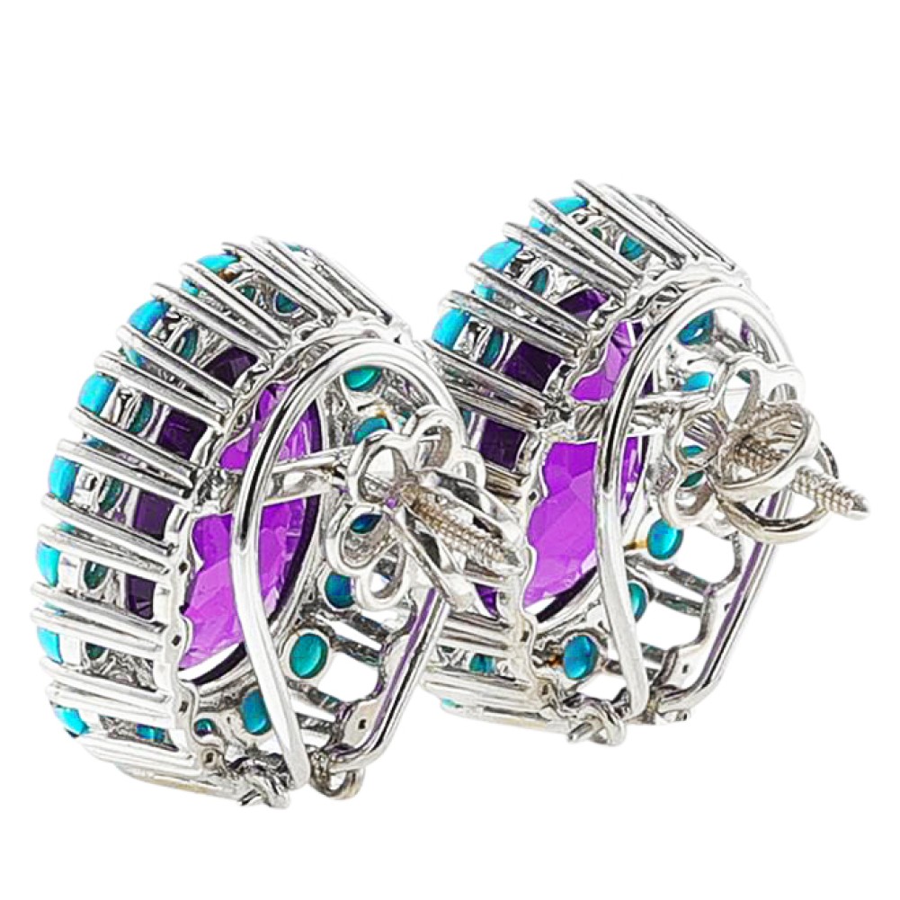 Each set with an oval-shaped amethyst, surrounded by round turquoise cabochons.