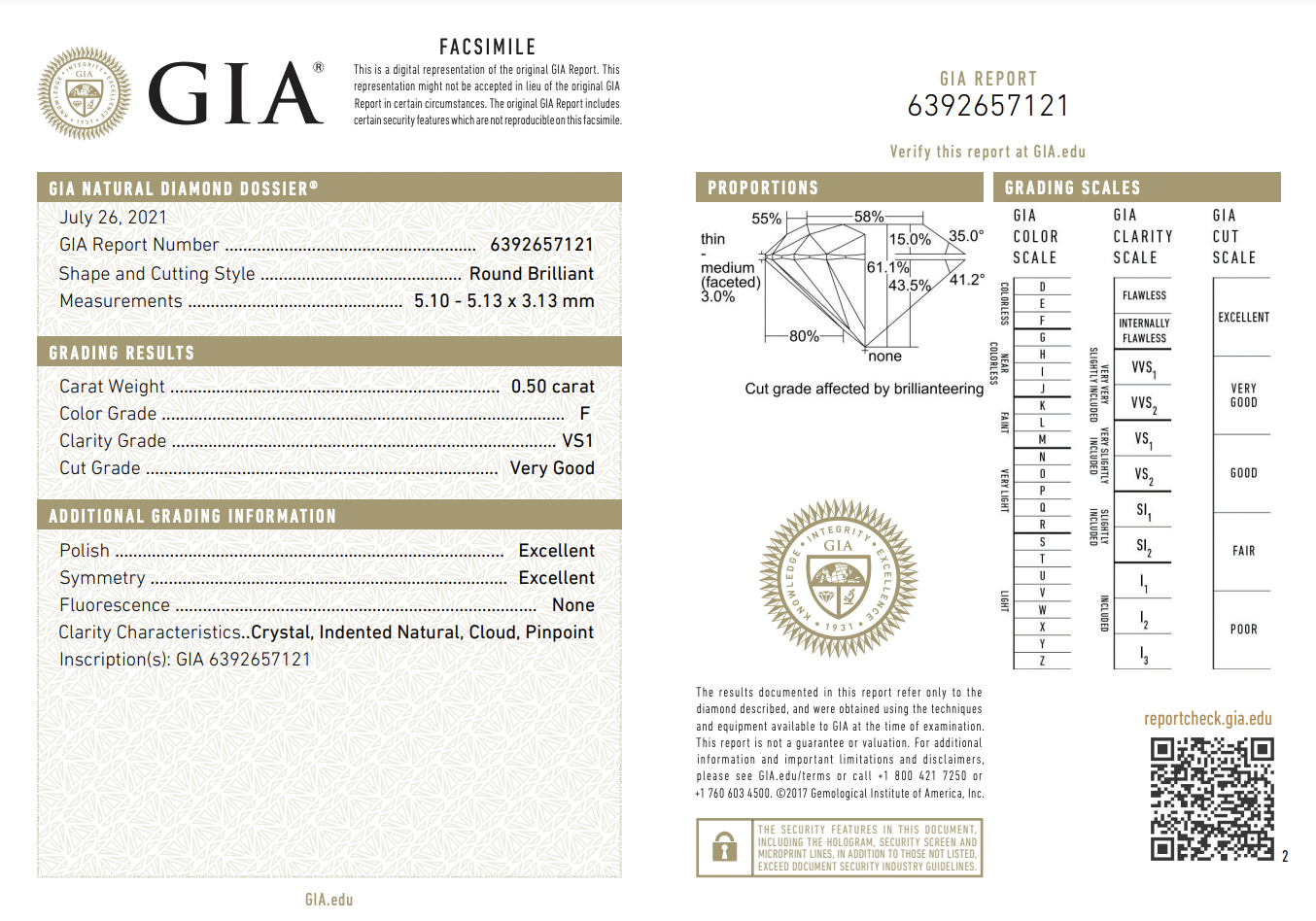 - Accompanied by GIA report no. 6392395223, stating the 0.50 carat diamond is F color and VS1 clarity, excellent cut with faint fluorescence