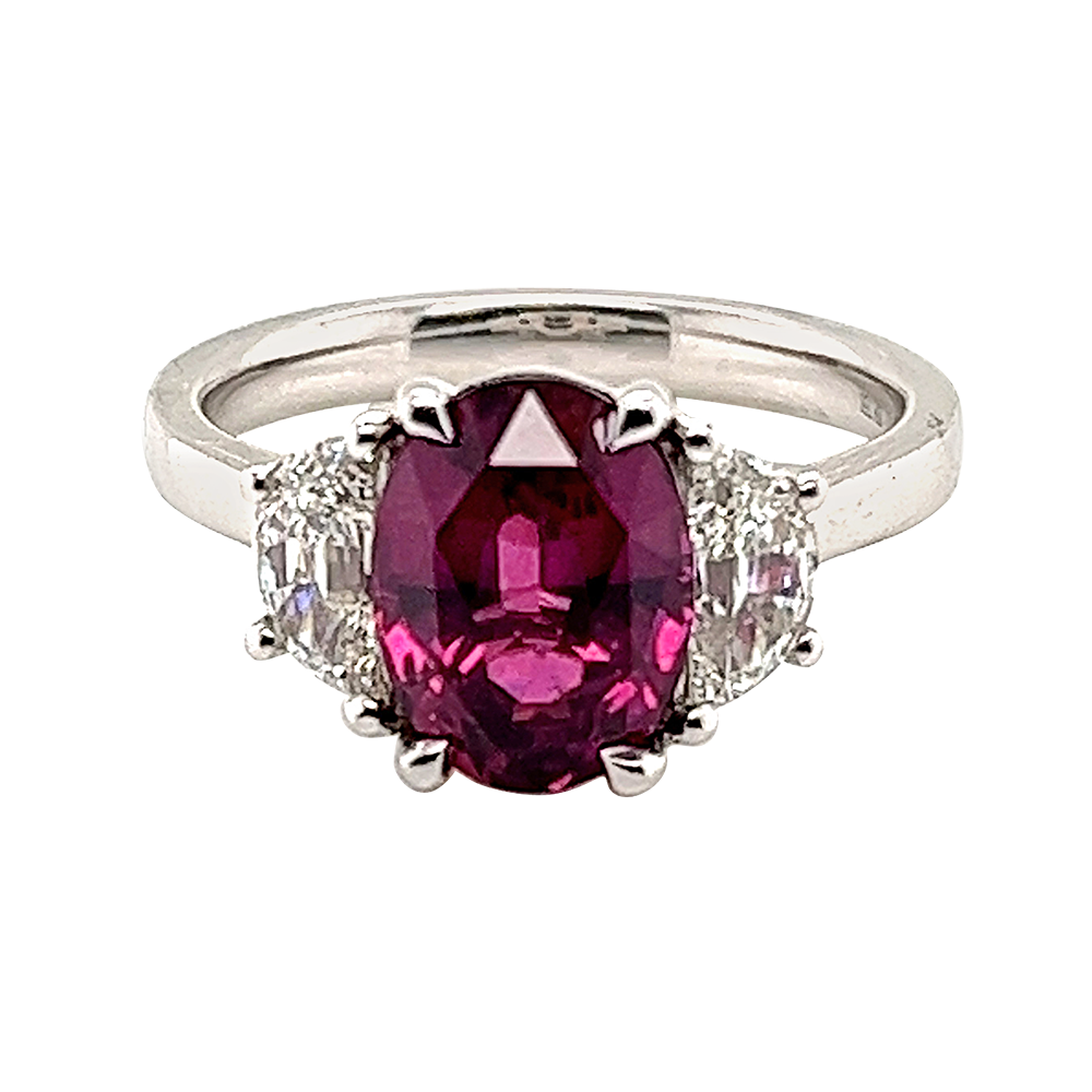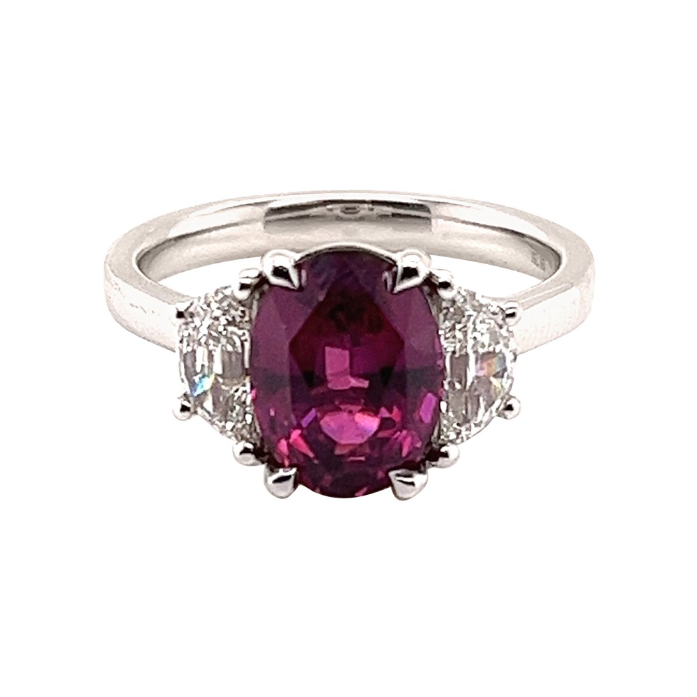 Centering an oval-shaped ruby, accented by 2 trapezoid diamonds.