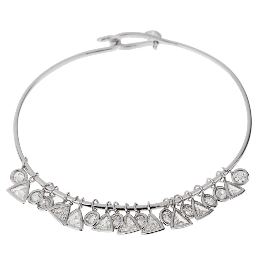 The bracelet designed as a bangle featuring numerous round and trillion-cut, bezel-set diamond charms.