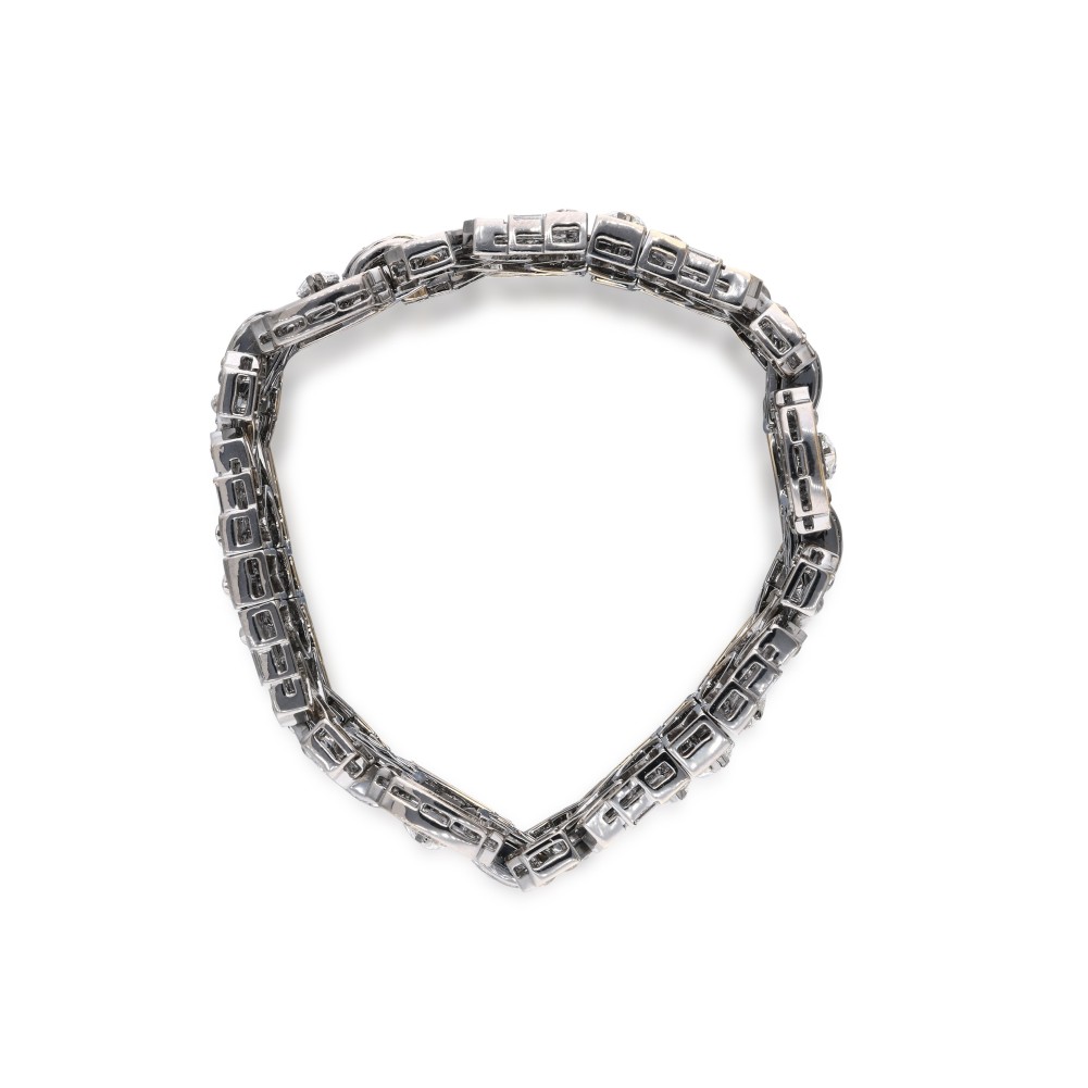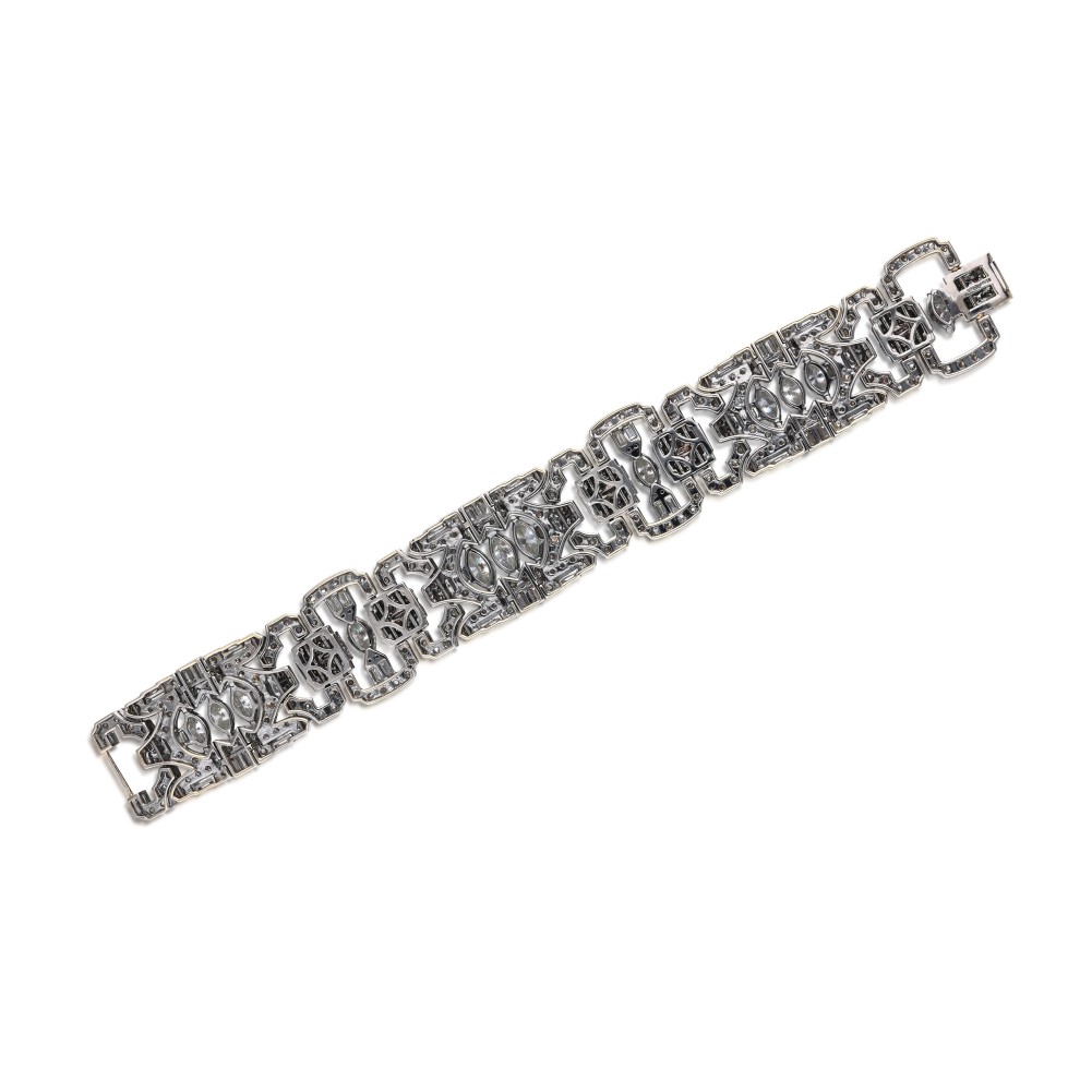 Composed of marquise, baguette and round brilliant and single-cut diamonds arranged in an Art Deco-inspired bracelet.