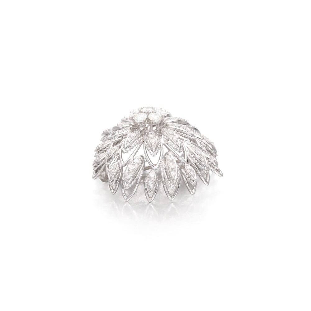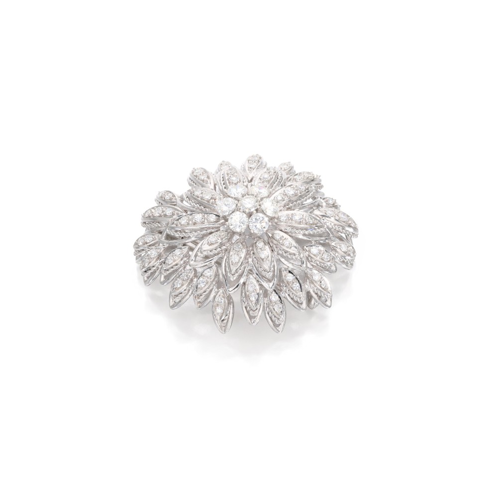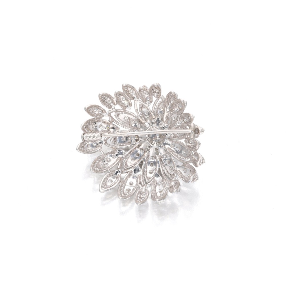 Composed of round brilliant and single cut diamonds arranged as a domed flower.
