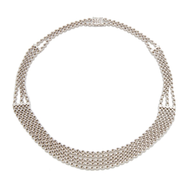 Designed as a 5-row diamond bezel set necklace.