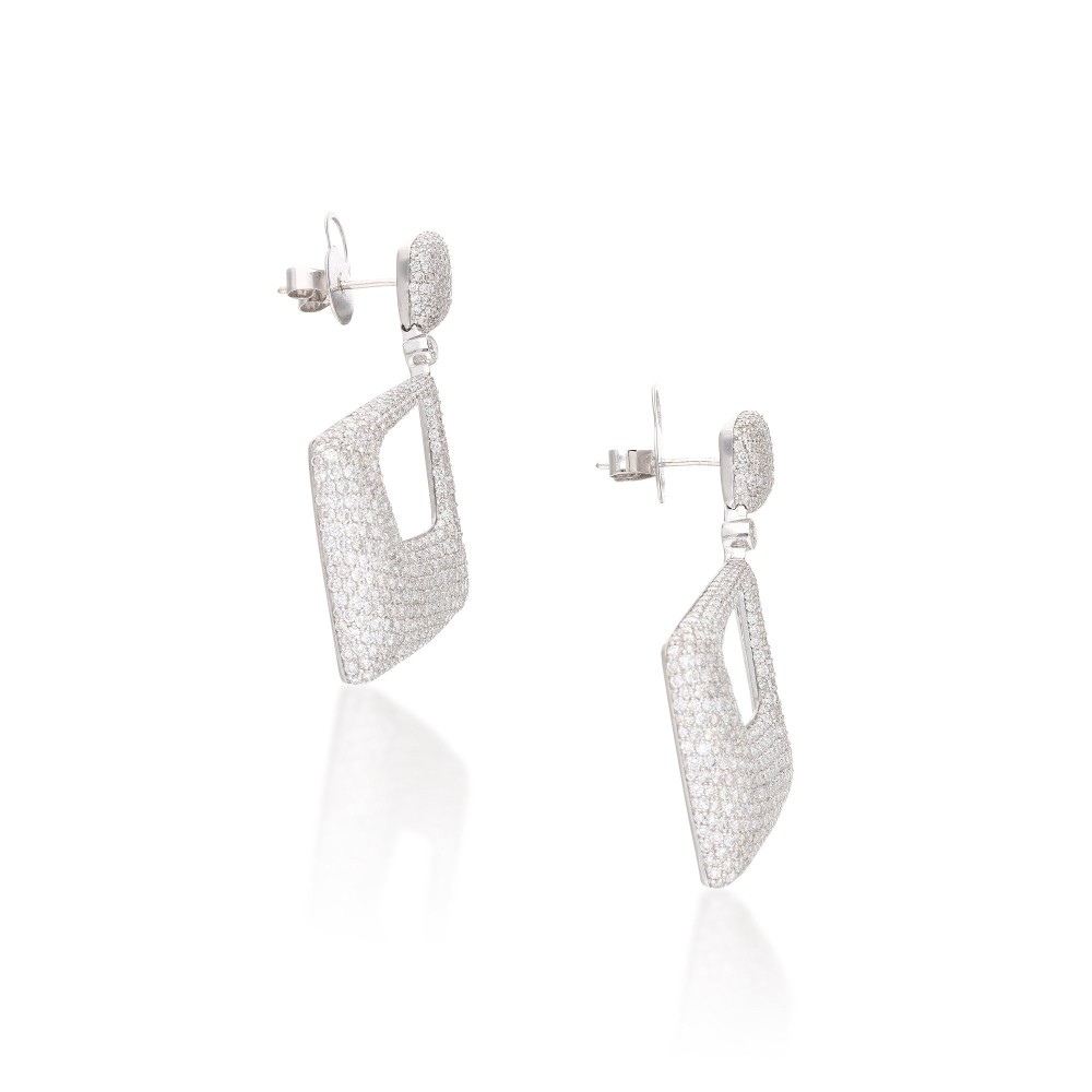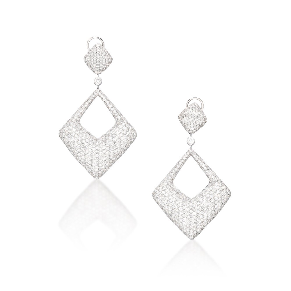 Drop earrings composed of round brilliant-cut diamonds.