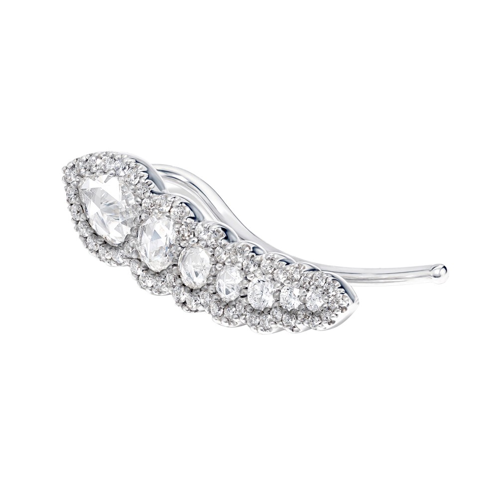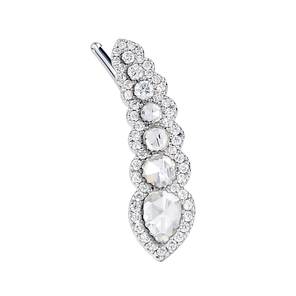 Set with 1 pear-shaped rose-cut diamond, 2 round rose-cut diamonds and 3 round brilliant cut diamonds, accented by additional small round diamonds.