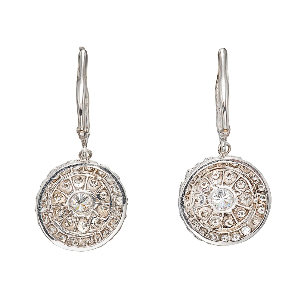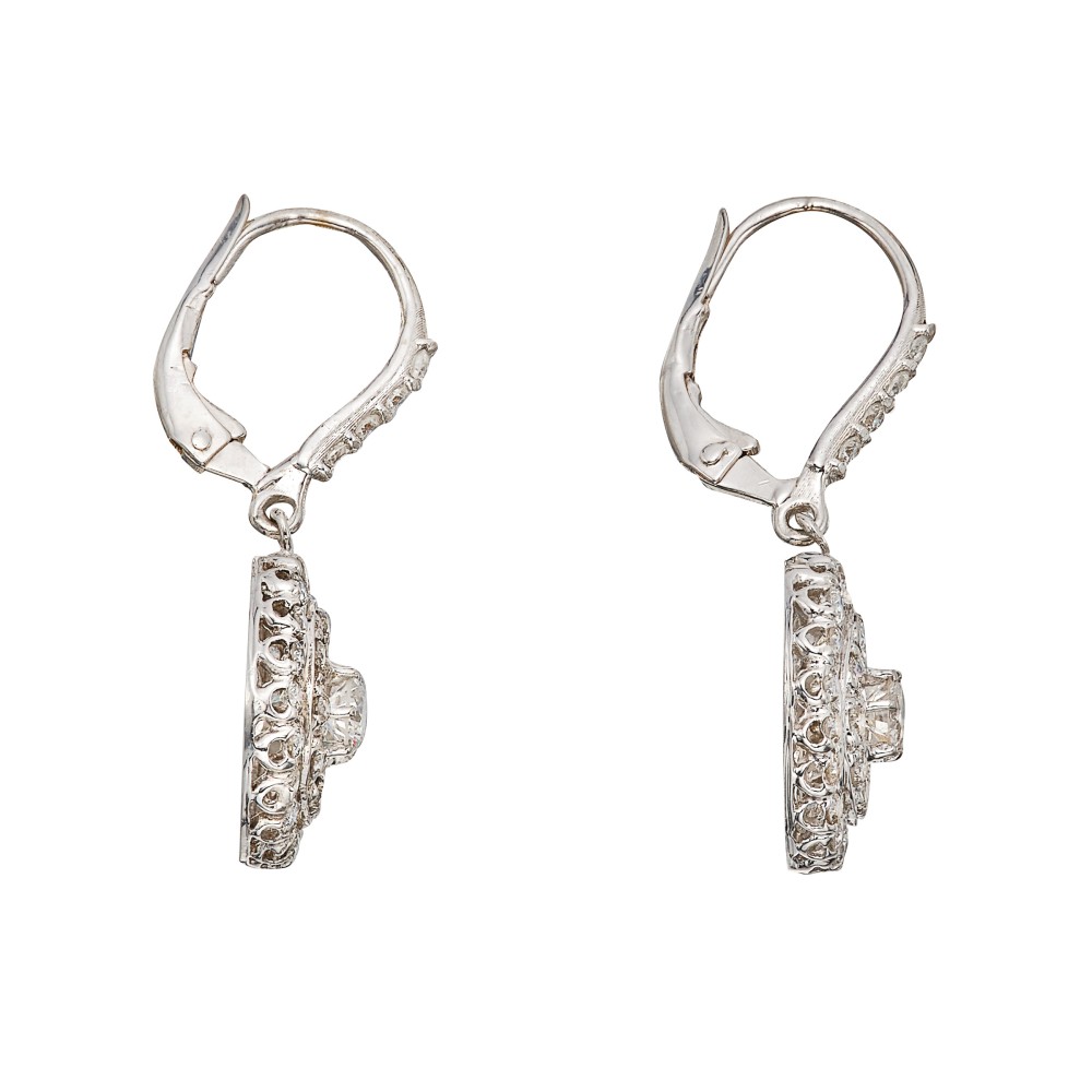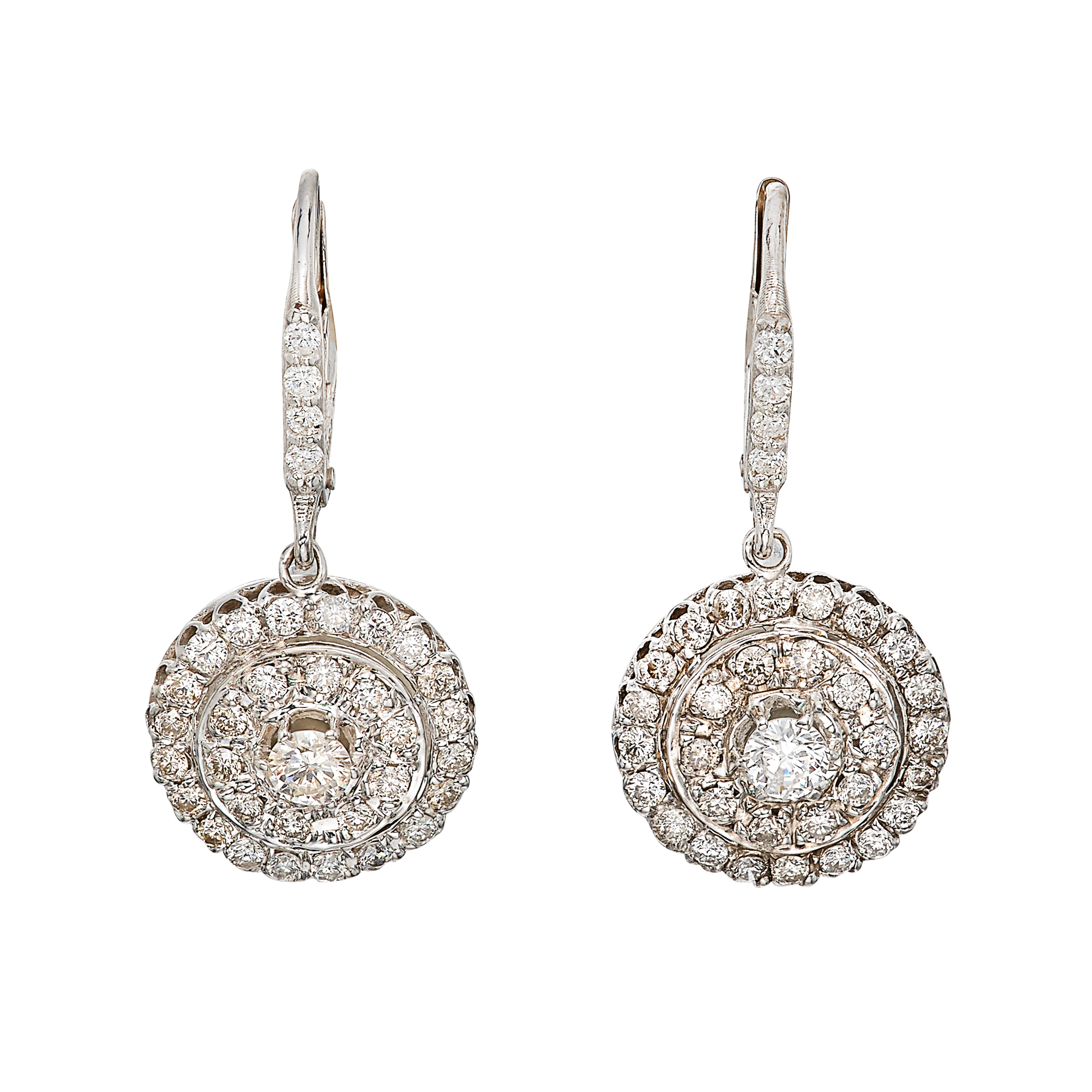 A pair of pendant earrings featuring 70 round brilliant cut diamonds set in white gold.