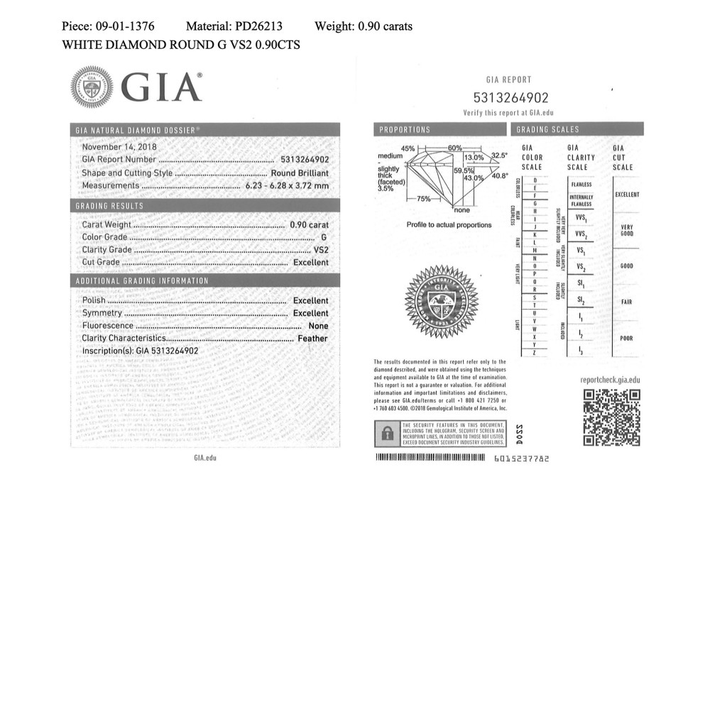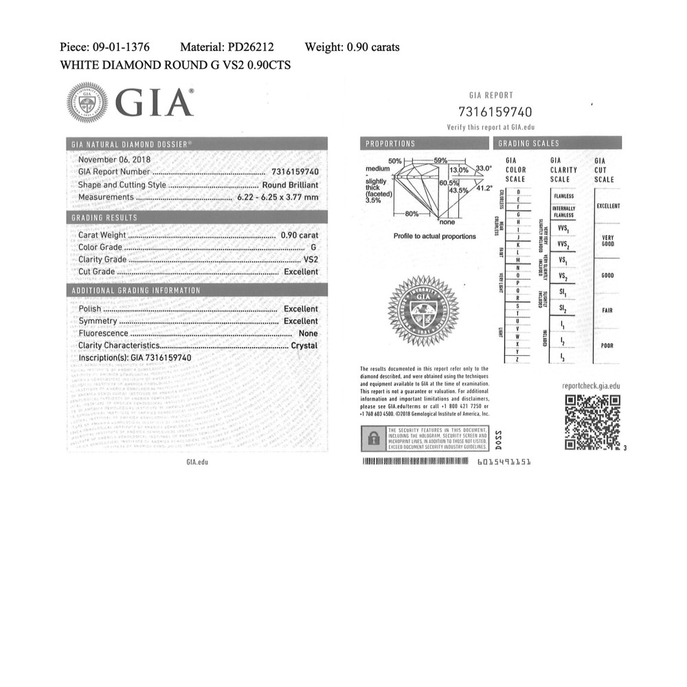- Accompanied by 2 GIA reports No. 7316159740, dated November 06, 2018, stating the 0.90 carat round brilliant cut diamond is G color and VS2 clarity with excellent cut, polish and symmetry; No. 5313264902, dated November 14, 2018, stating the 0.90 carat round brilliant cut diamond is G color and VS2 clarity with excellent cut, polish and symmetry