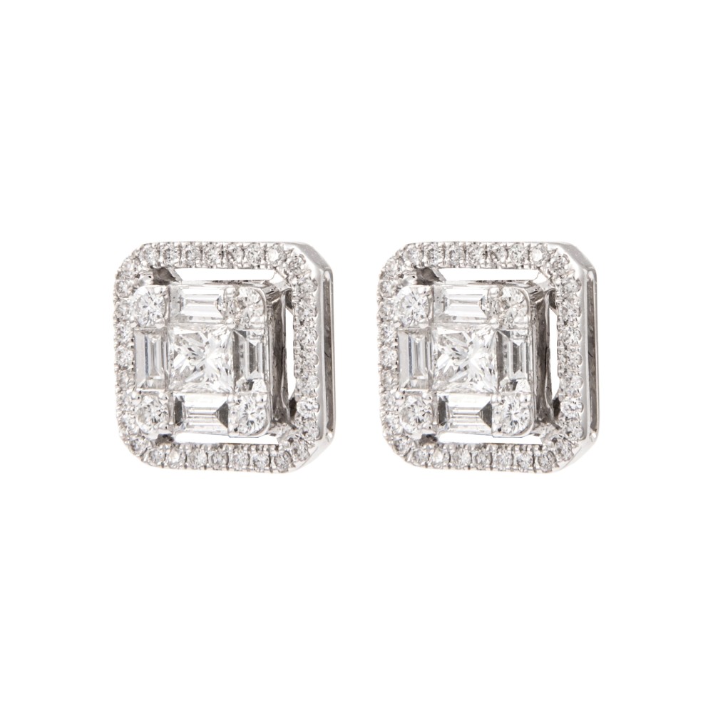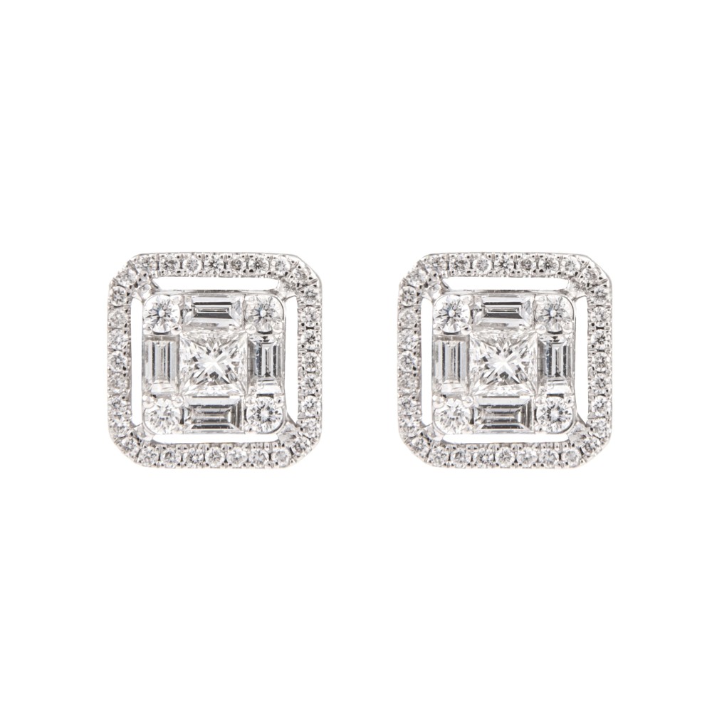 Featuring square-shaped illusion set diamond studs, composed of 82 baguette-, round- and princess-cut diamonds.