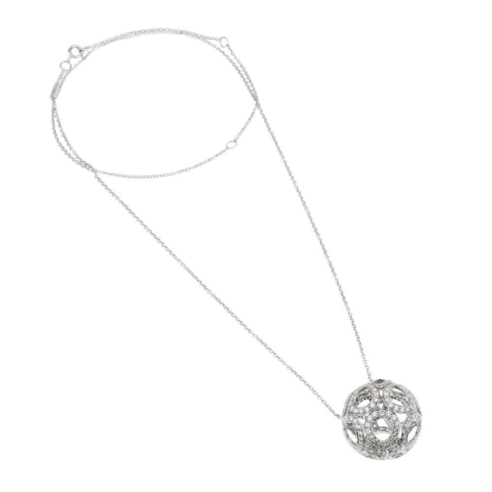 Of openwork design, showcasing floral motifs in a circular globe with round brilliant cut diamonds suspended from a station necklace.