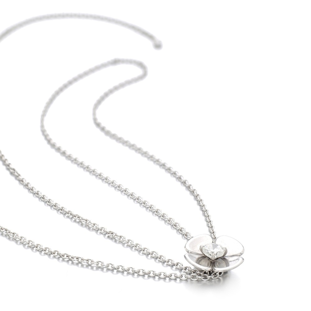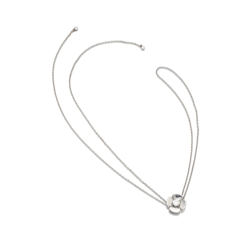 Designed as a moveable diamond flower head pendant, set with a diamond supported from a chain.