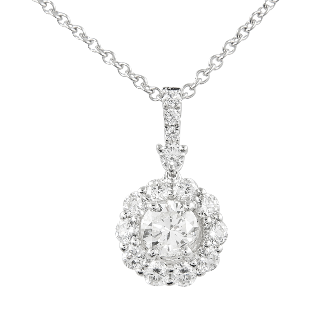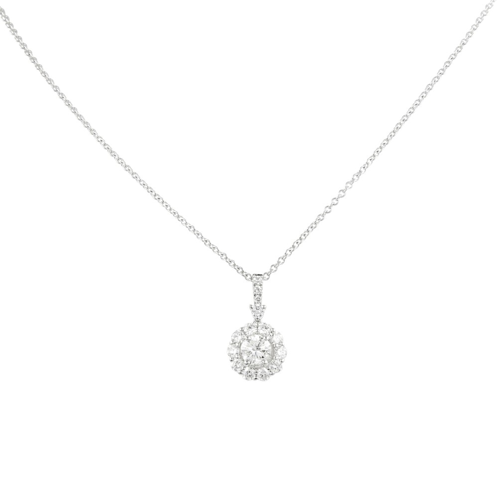 Centering a round brilliant diamond surrounded by a halo of 14 round brilliant diamonds.