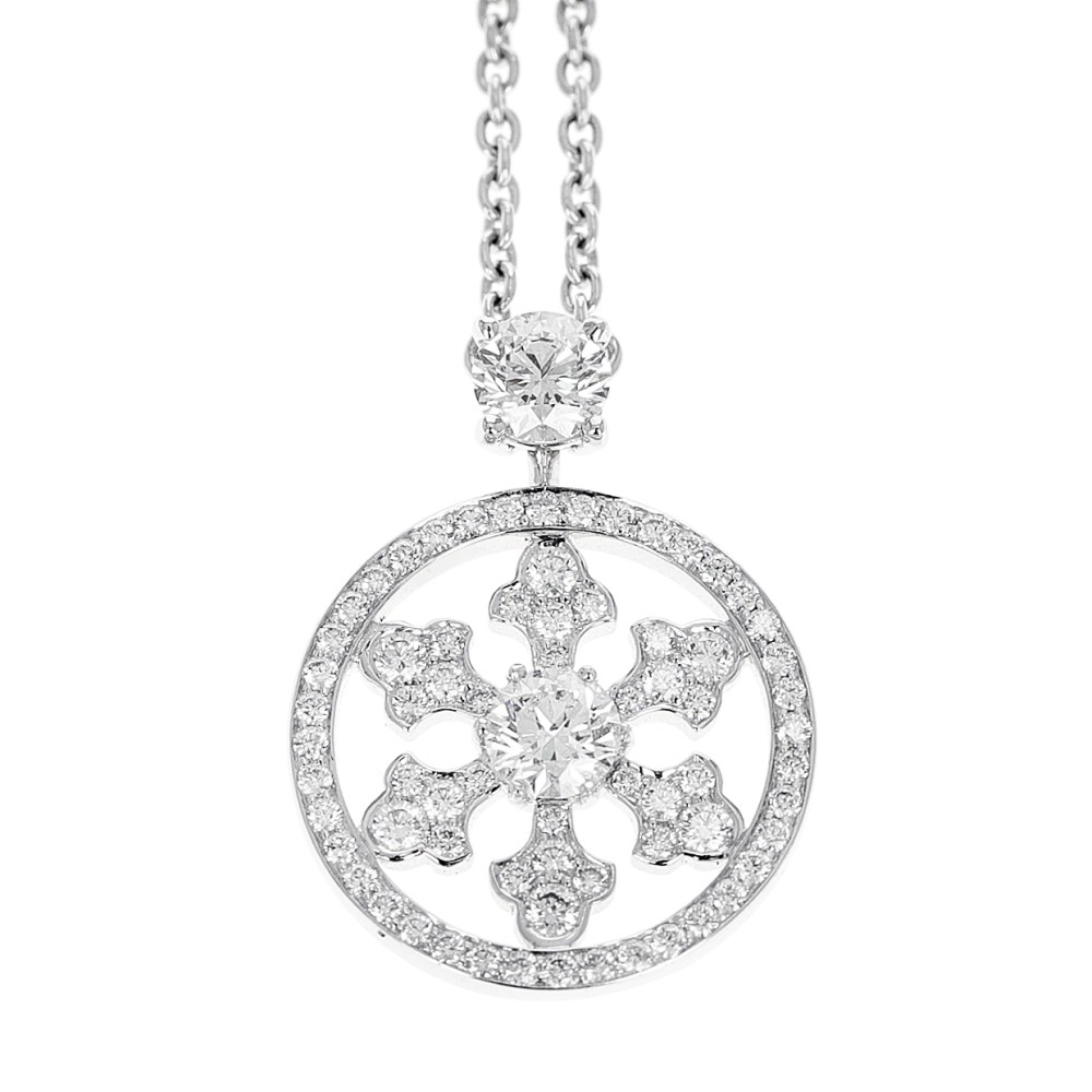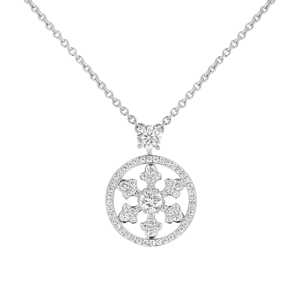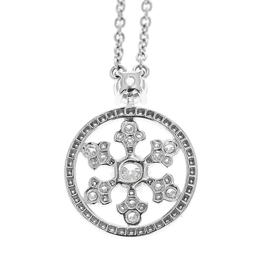 Designed as a snowflake, set with round brilliant cut diamonds.