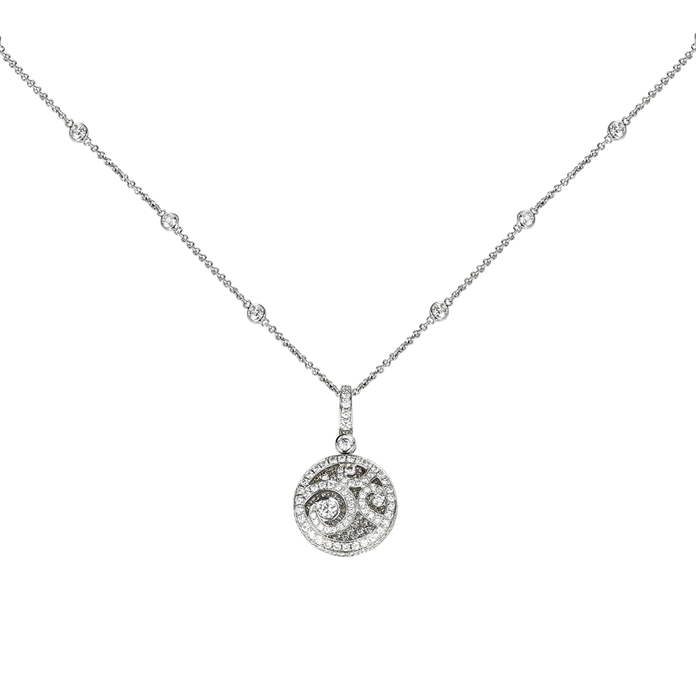 Featuring hollowed pendant with pav? diamonds inside out, with gold chain with 14 diamond stations.