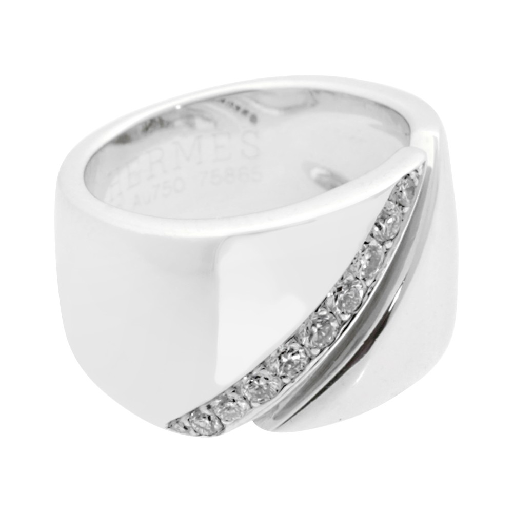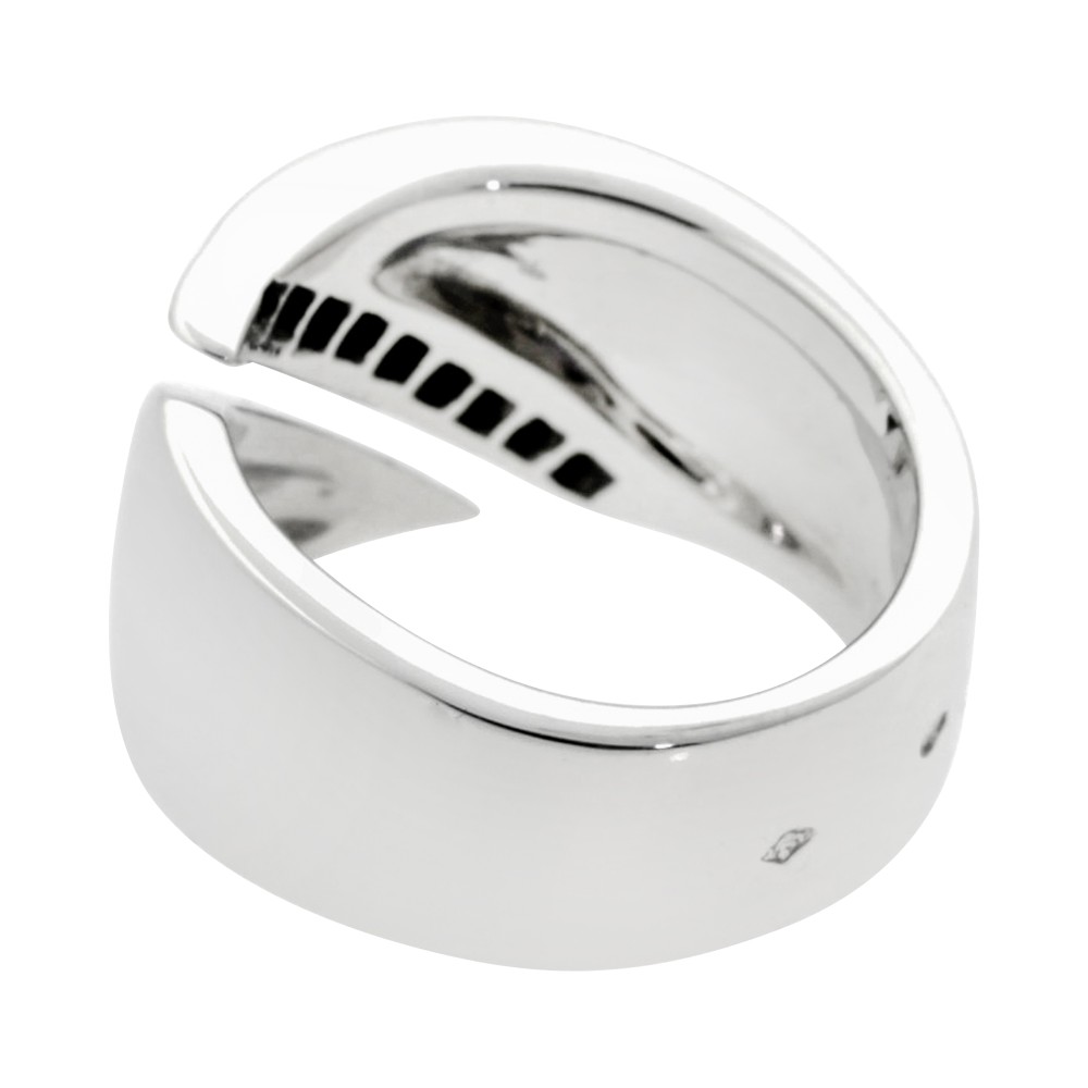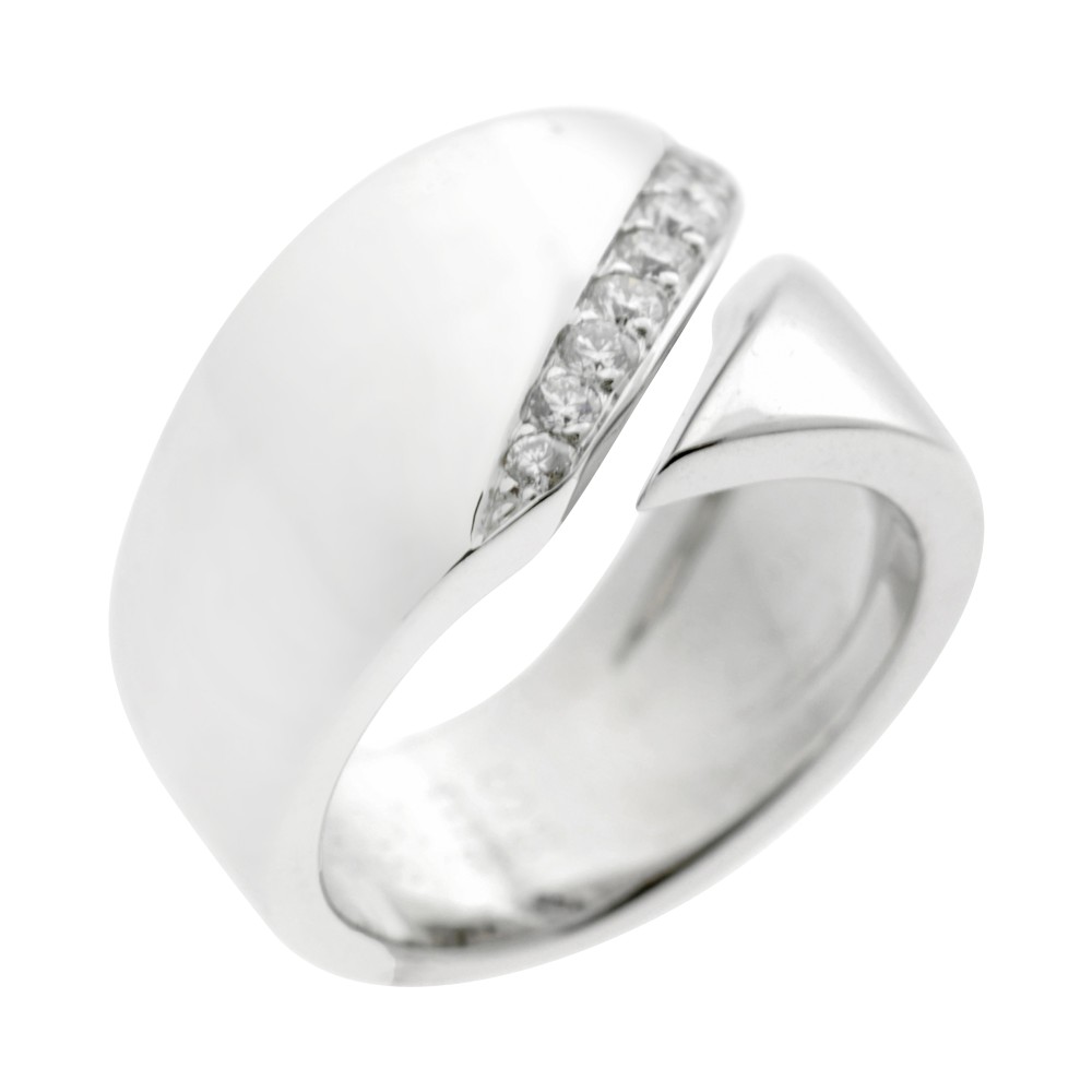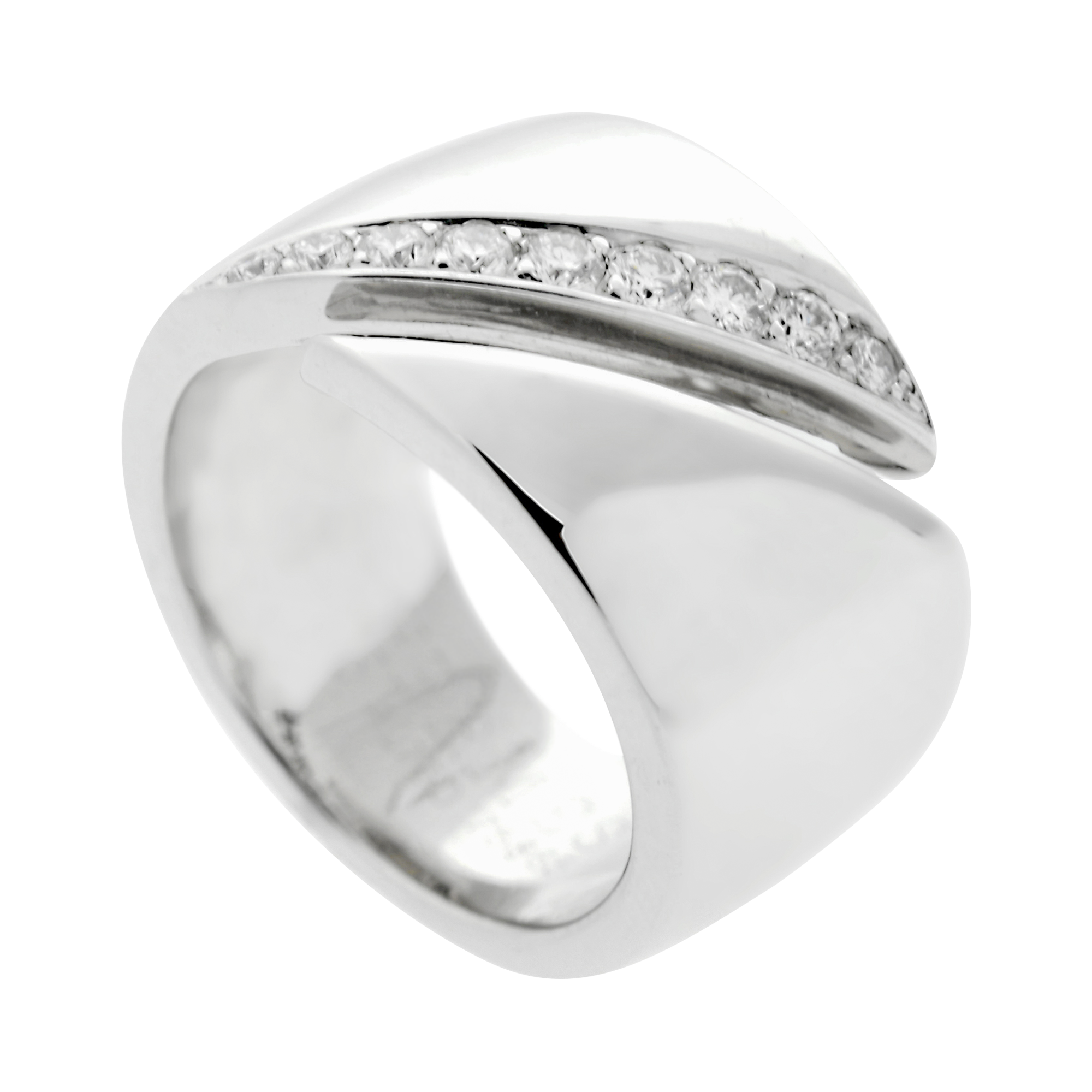 Designed as a bypass band, the edge of one part of the band set with numerous round diamonds.