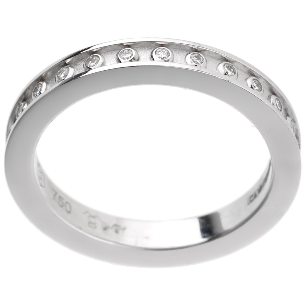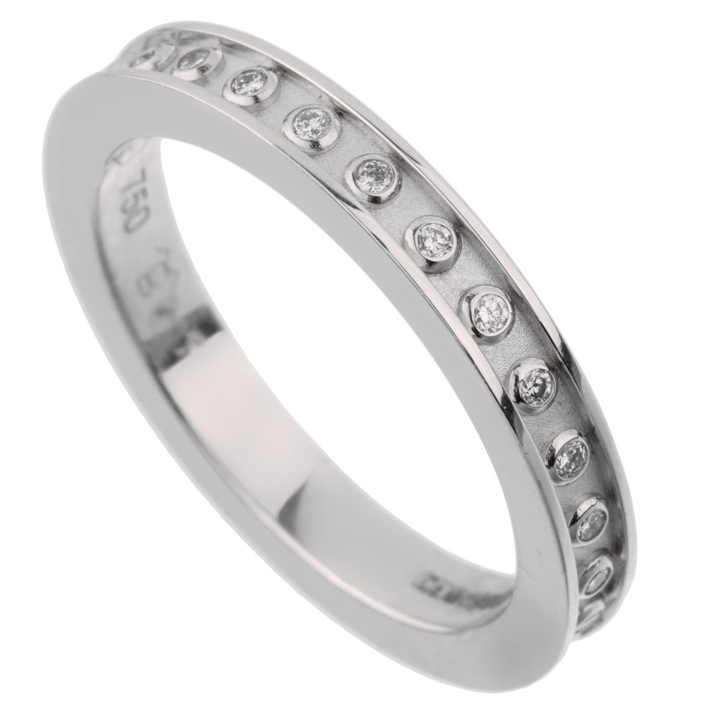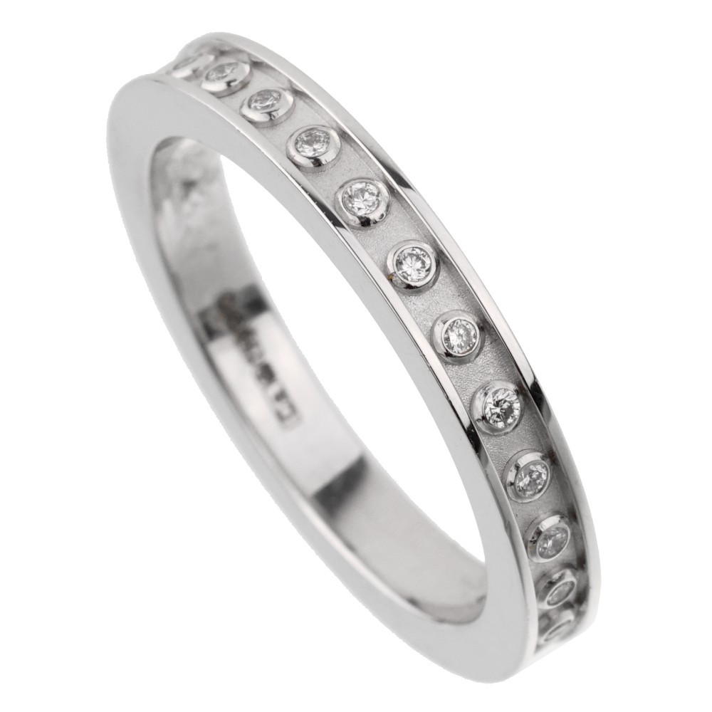 The ring designed as a band featuring numerous bezel set round diamonds.