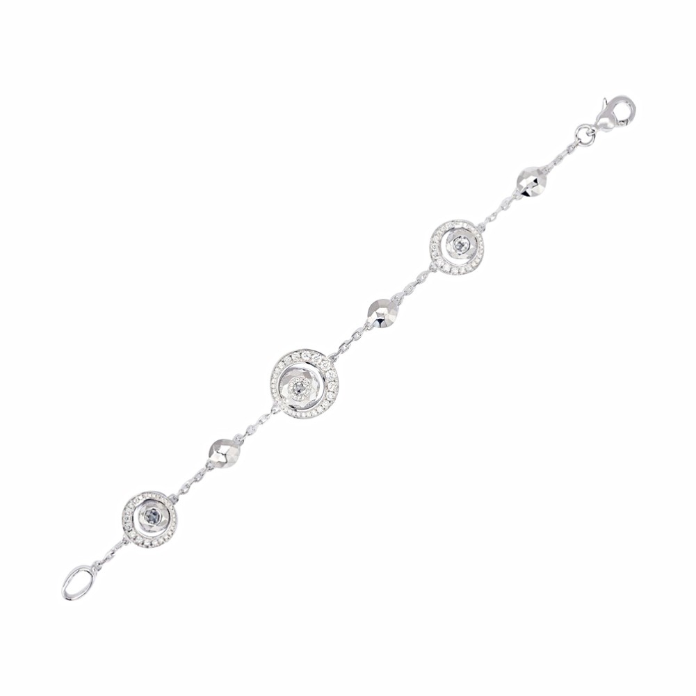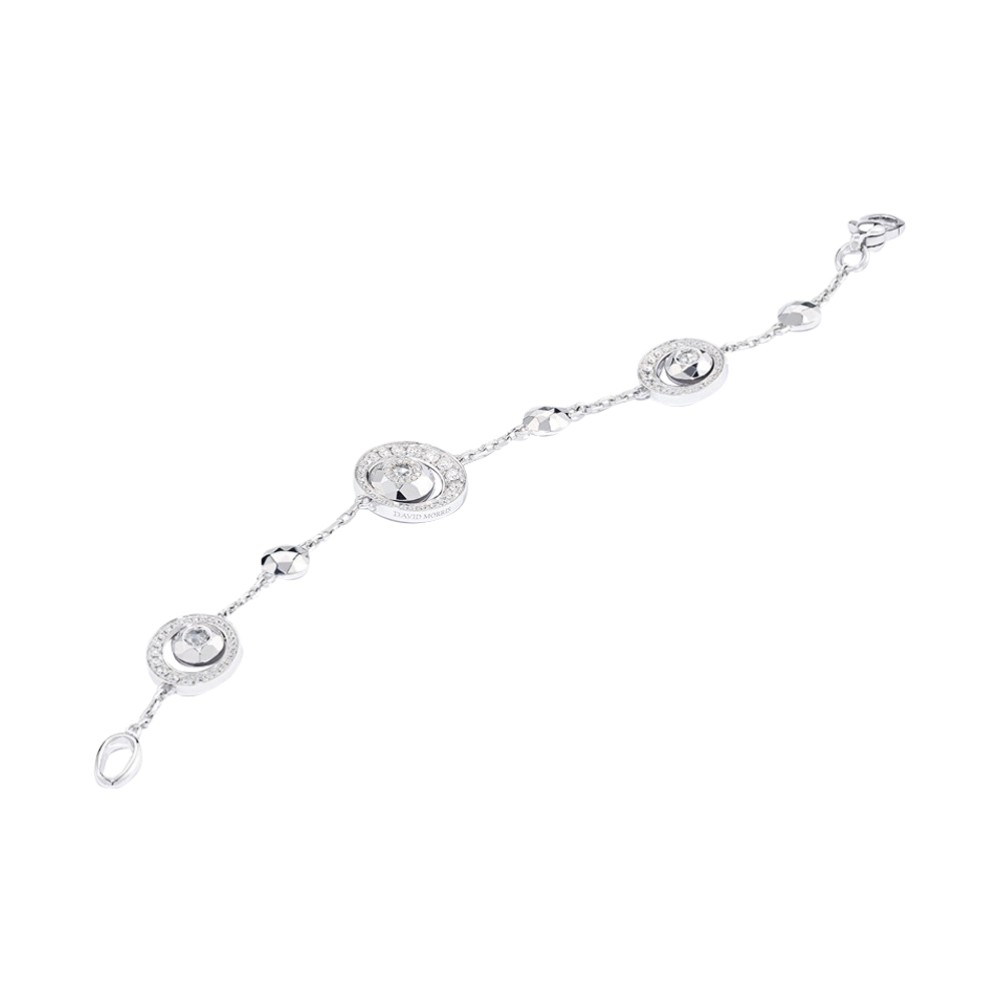 Featuring three stations, designed with 1 rose-cut diamond, faceted high-polish gold and graduated round brilliant cut diamonds, alternating with 3 faceted gold discs.