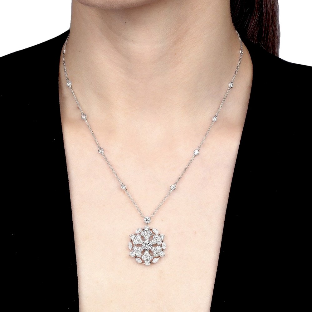 The pendant designed as an openwork snowflake, set with numerous round and marquise-shaped diamonds attached to a white gold chain intermittently with bezel-set round diamonds.
