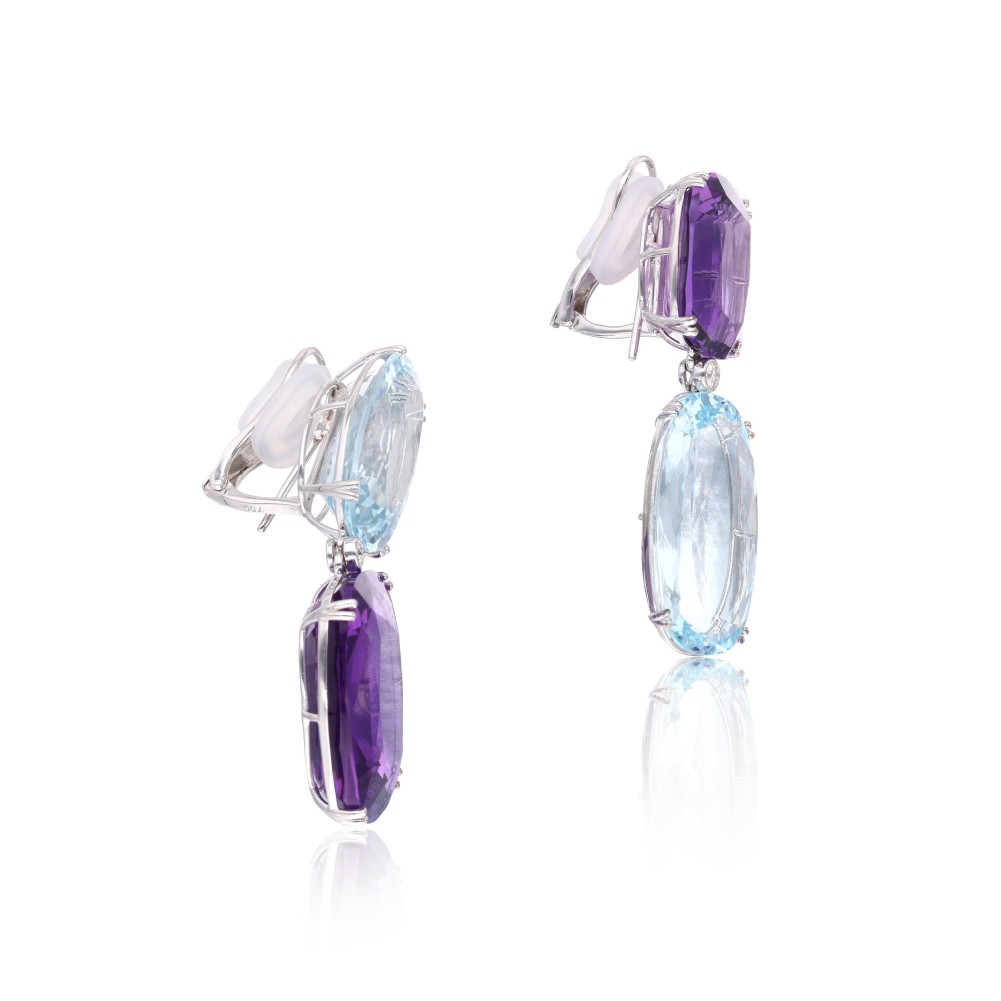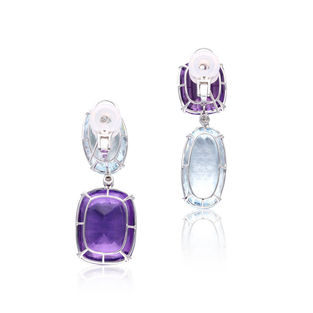 Set with 2 oval aquamarines and 2 cushion-shaped amethysts, accented by 2 round brilliant-cut diamonds.