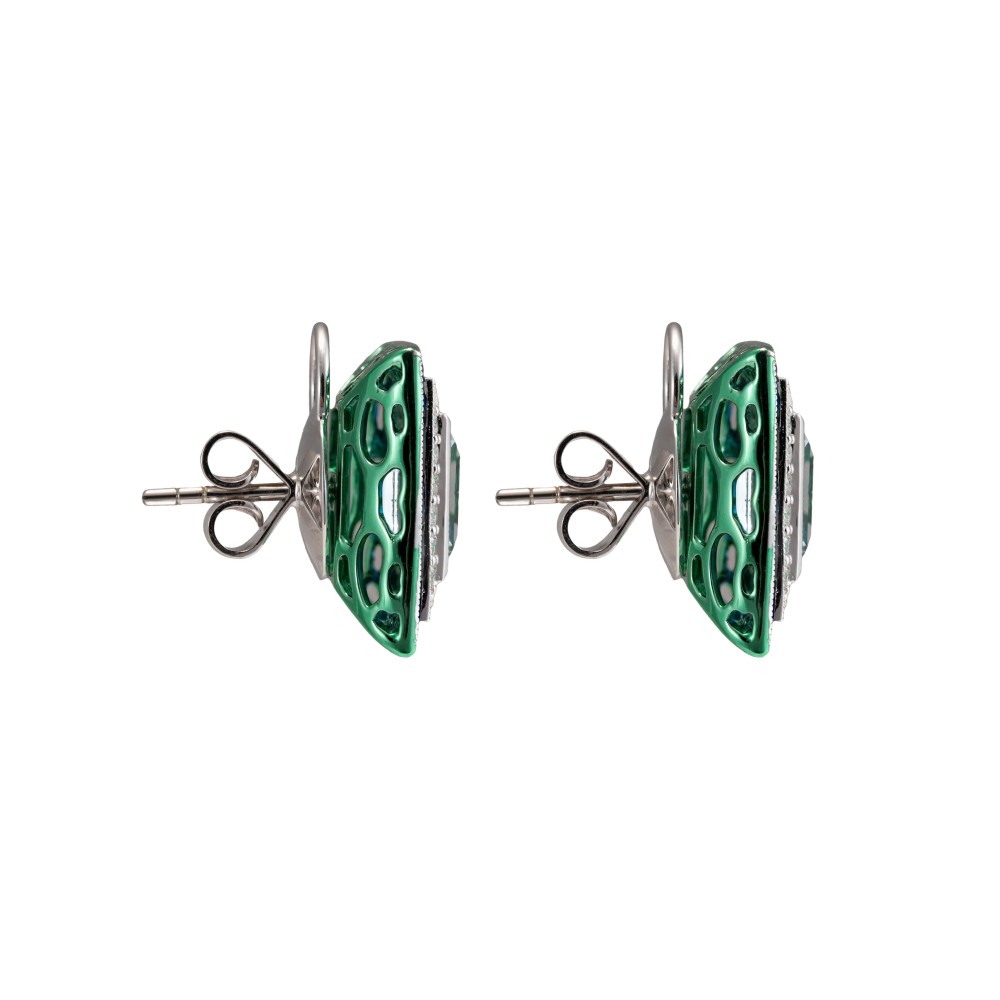 Centering an aquamarine, framed by round diamonds and sapphire in an art deco-inspired design.