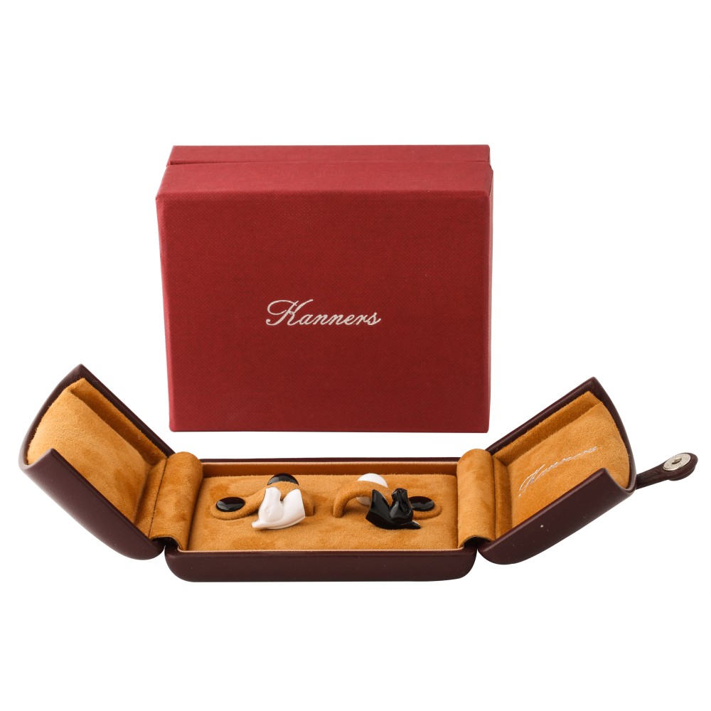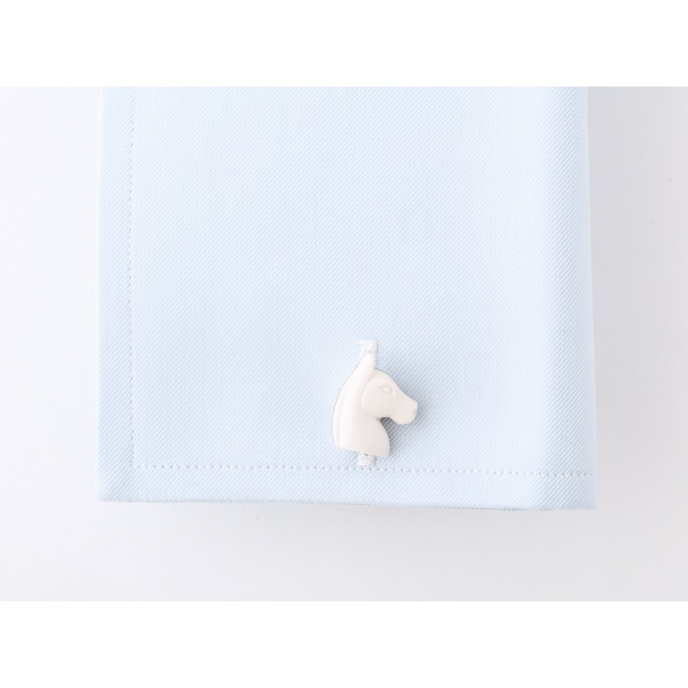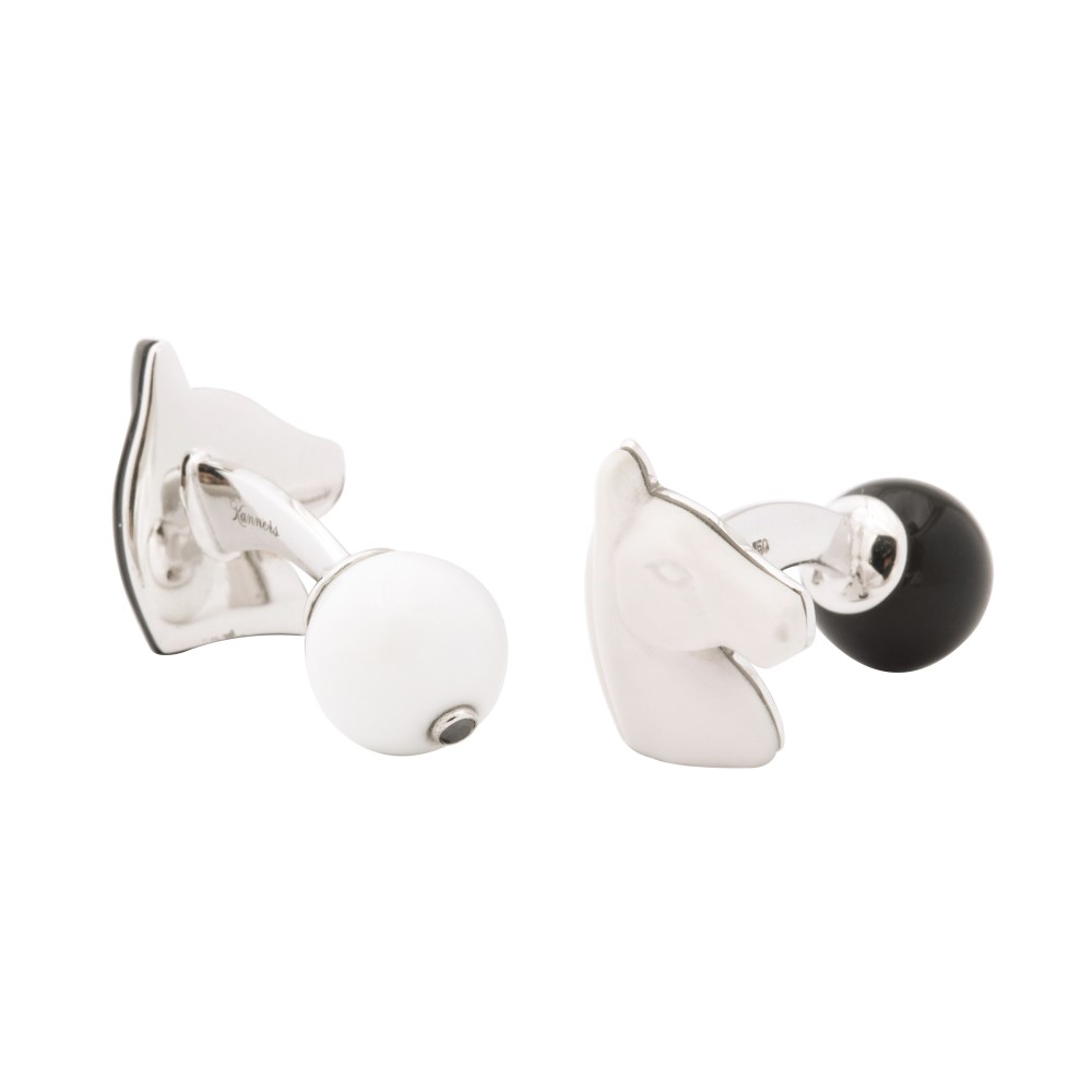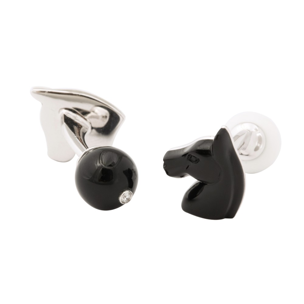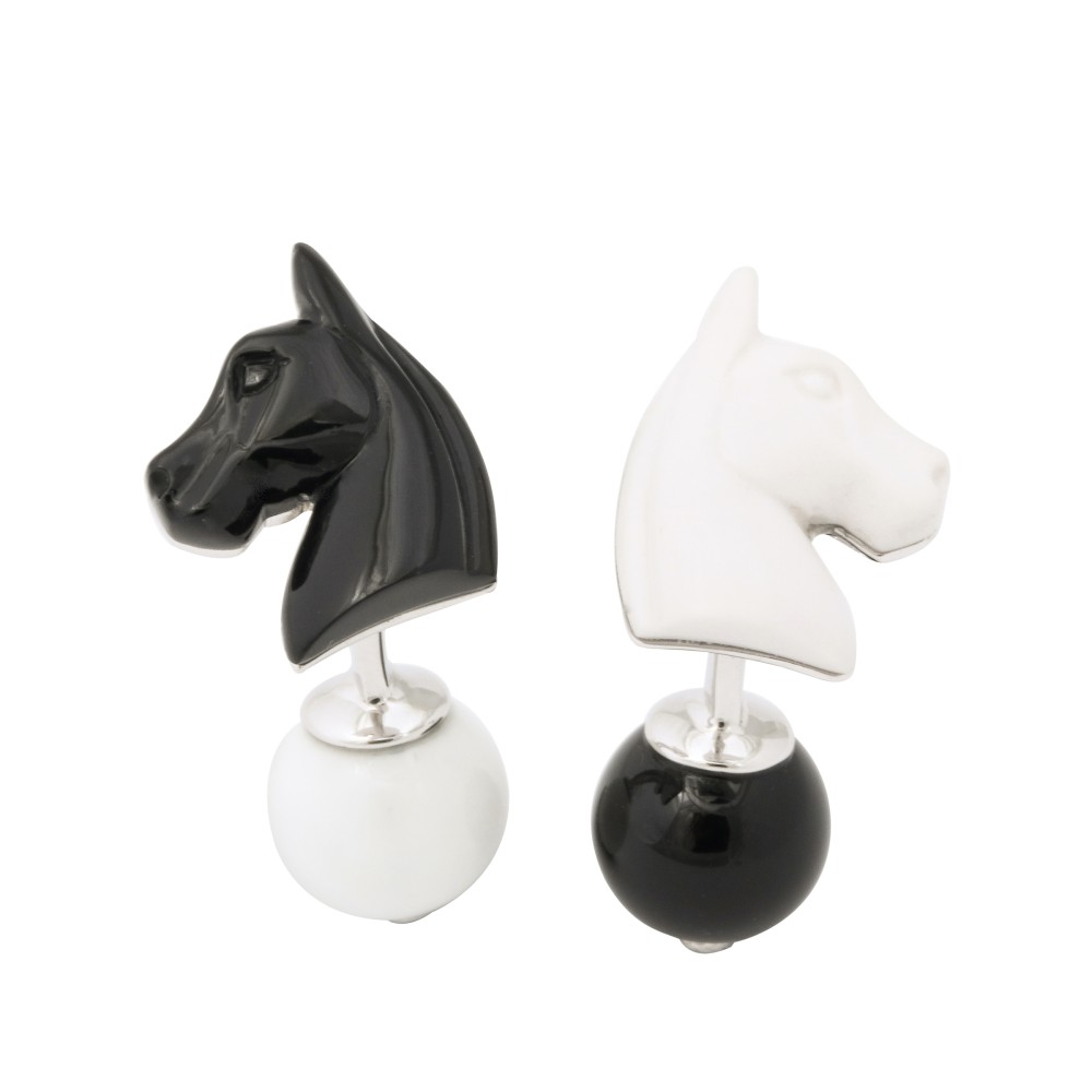 Pair of horse head cufflinks, set with hand-carved black onyx and white cocholong, spring back accented with cocholong, black onyx and diamonds.