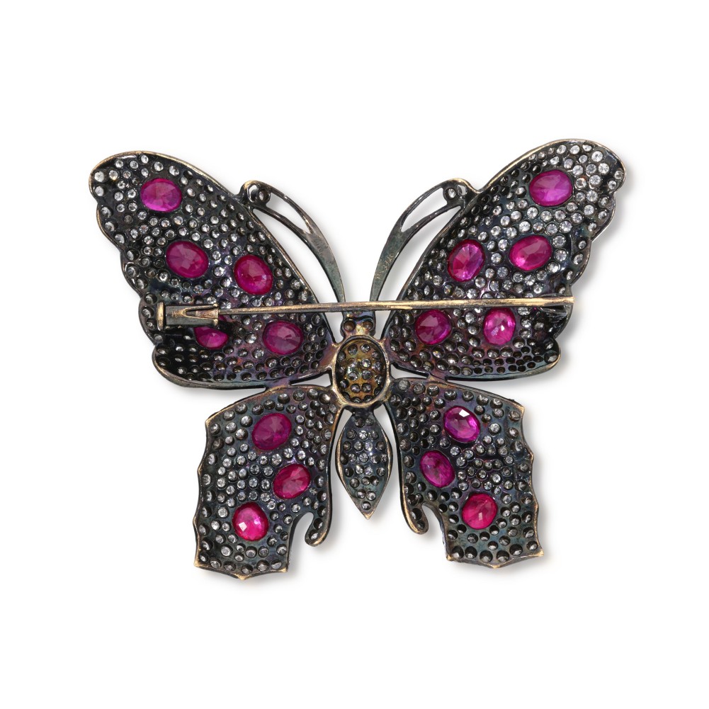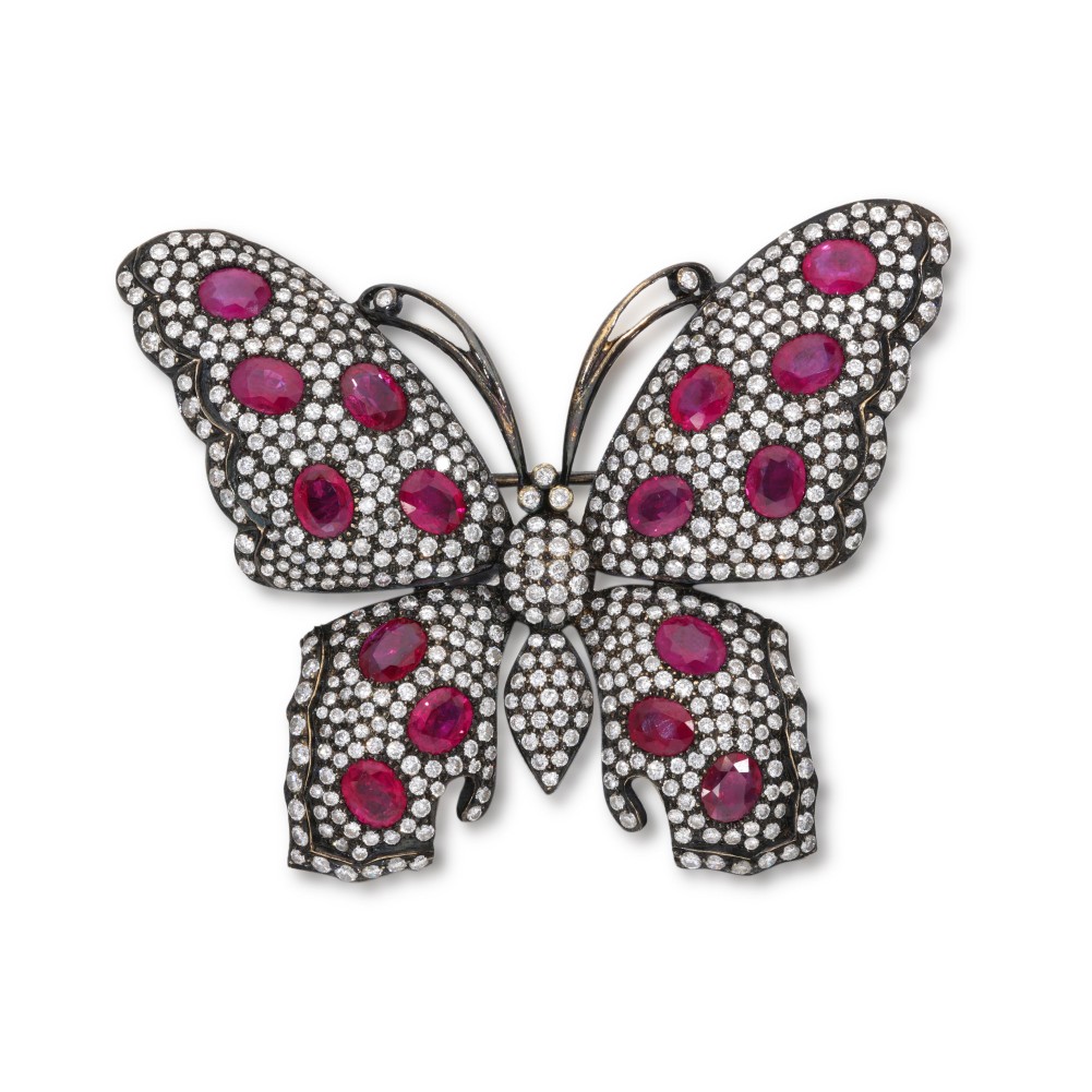 Composed of rubies and diamonds in a butterfly design.