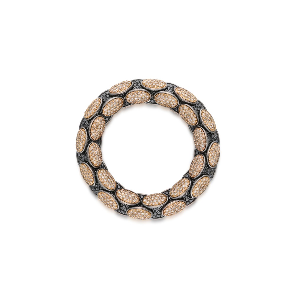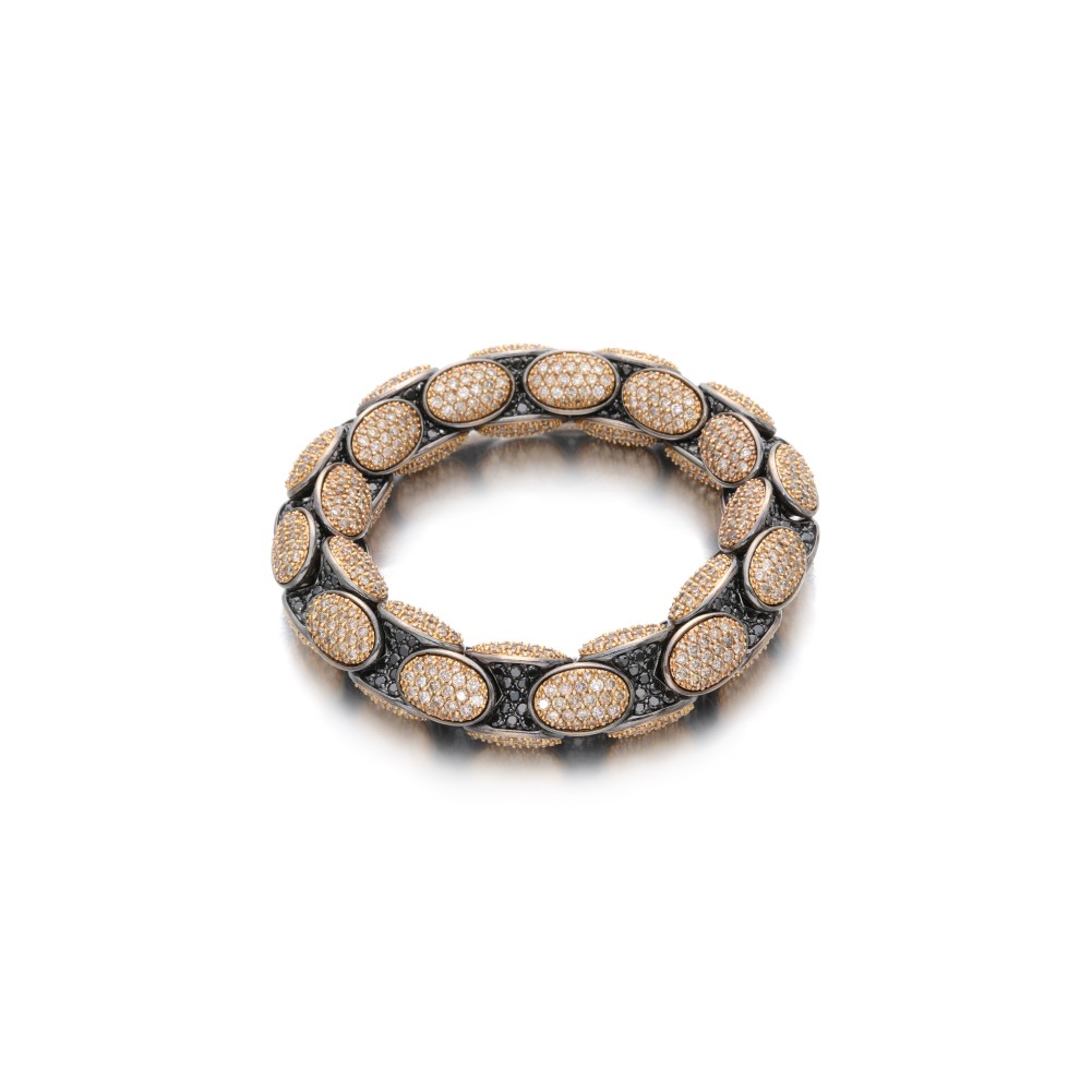 Of the Anaconda collection, composed of round brilliant-cut brown and black diamonds on a flexible, expandable bracelet.