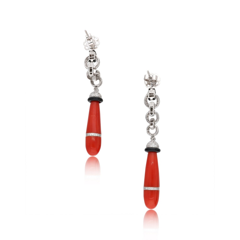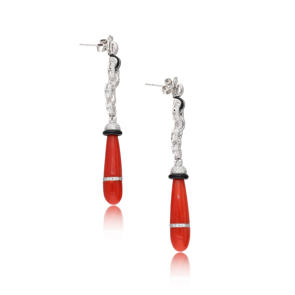 Drop earrings composed of coral and onyx, accented by round brilliant-cut diamonds.